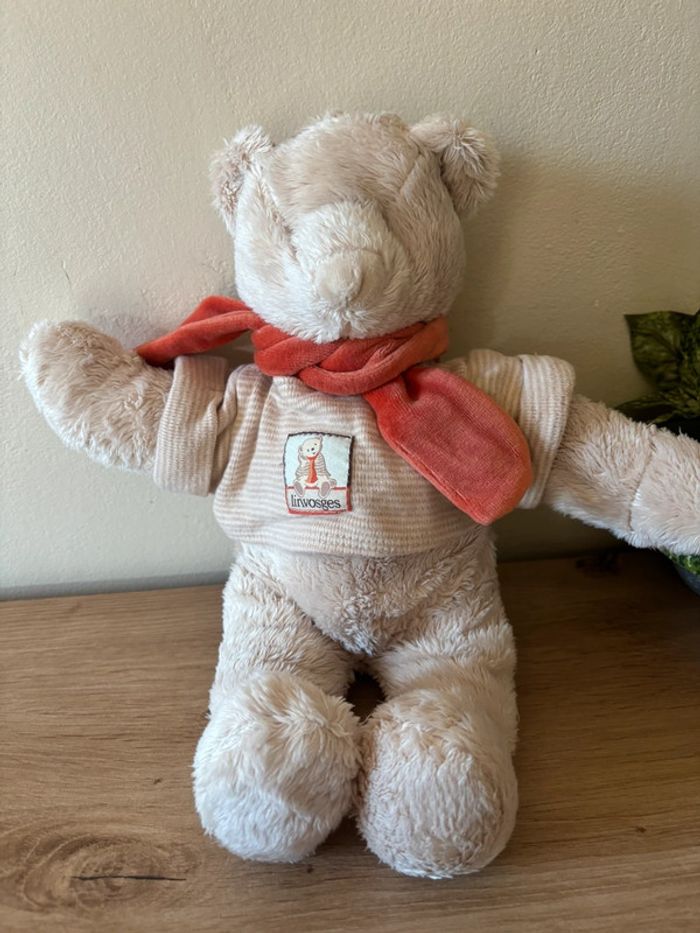 Doudou peluche ours beige pull linvosges écharpe orange moulin roty