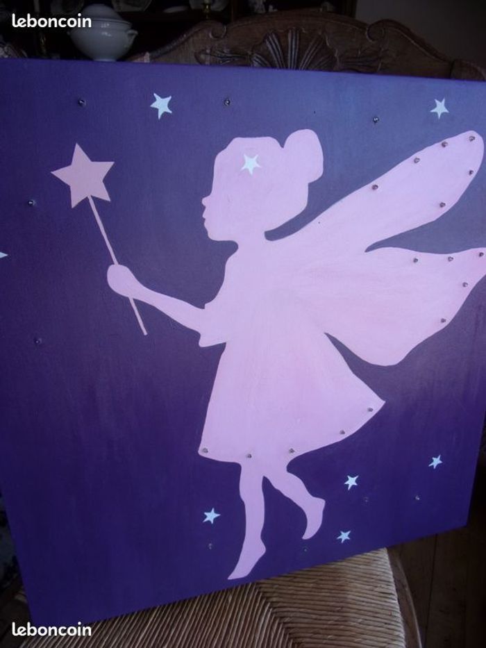 Grand CADRE 48 X 48 FEE lumineuse... nombreux points lumière activés par petite languette Couleur VIOLET foncé avec la Fée en Rose Sur toile encadré bois Pile fournie