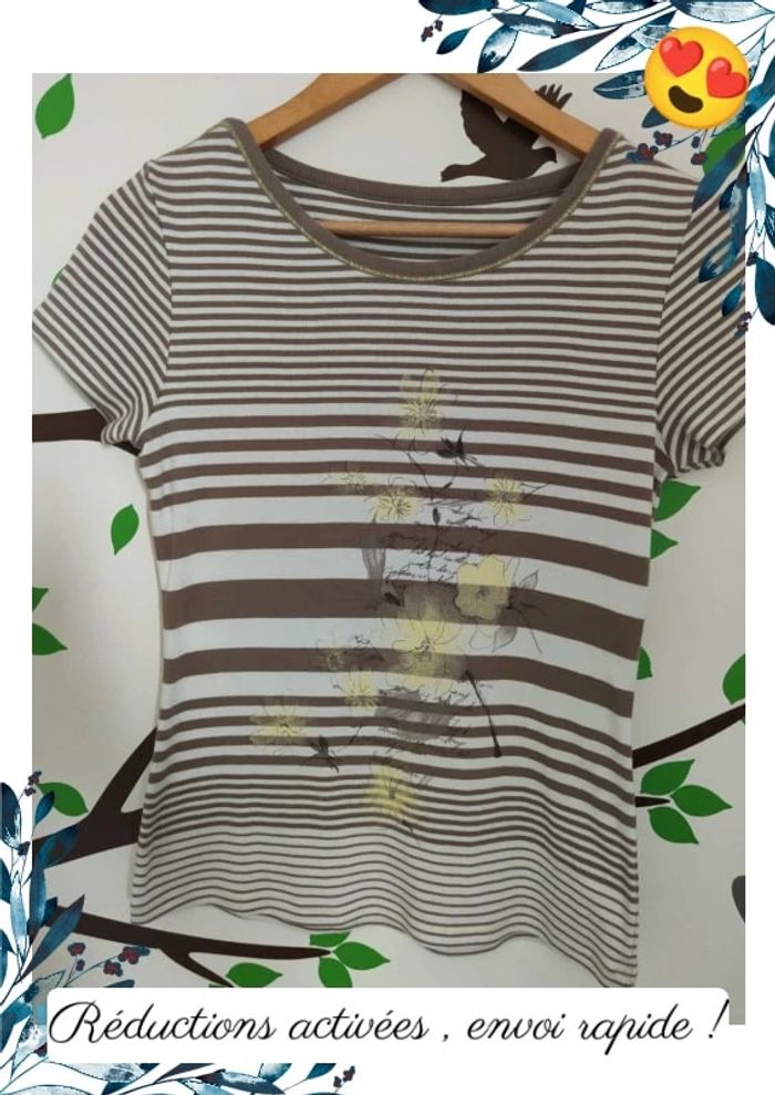 T-shirt marinière marron et blanc Fleurs en jaune pâle Légères taches jaunes en bas Taille environ S Mesures possibles sur demande D'autres articles femme dans mon dressing Dressing trié dans mon "à propos" Réductions lot activées : 🌿 Dès 2 articles : 5% 🌿 Dès 3 articles : 10% 🌿 Dès 5 articles : 15% 🍁 Articles bébé garçon 0 à 12 mois 🍁 Articles puéricultures, jouets 🍁 Articles femmes XS à XL 🍁 Articles homme S/M et baskets Jordan 40,5 🍁 Articles décorations, livres .. #sophie10270_haut_femme_été_s