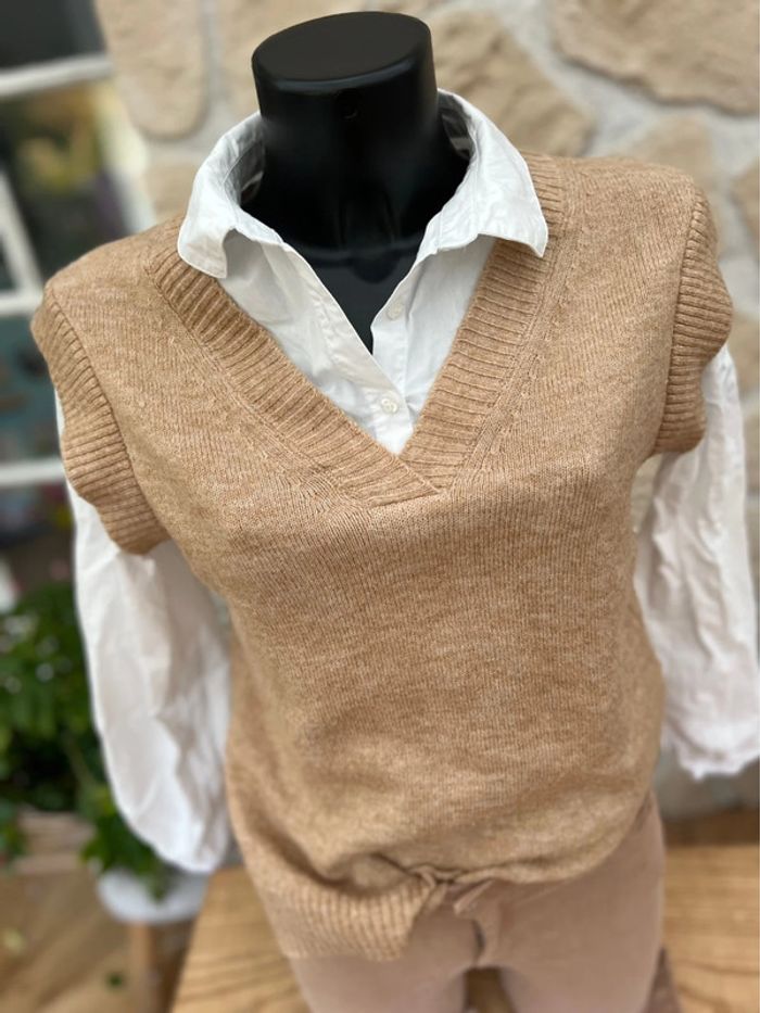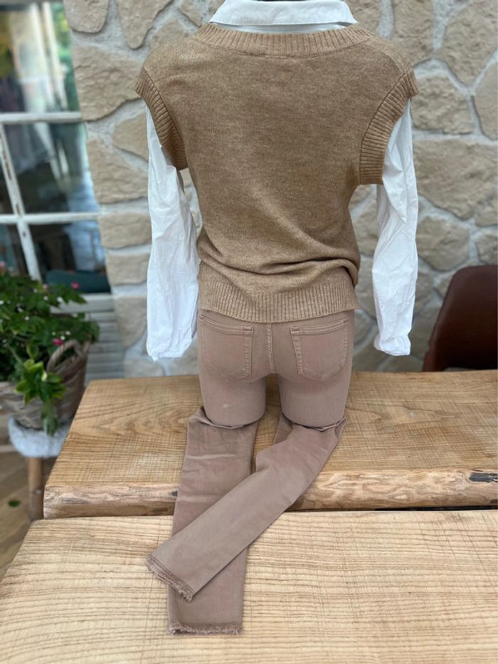 Ensemble en très bon état Mi saison automne hiver Taille XS 34 Pull loose 2 en 1 avec chemise incorporée blanche sous le pull sans manches beige marIe cache cache convient aussi pour du S 36 jean skinny marque only taille haute Le tout porté une fois acheté 70€!