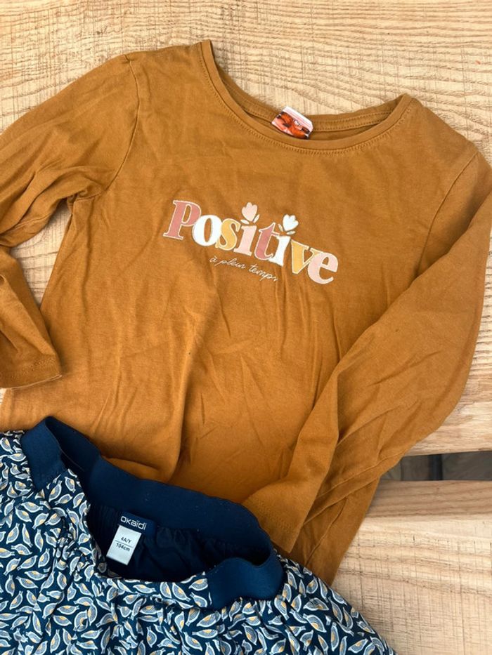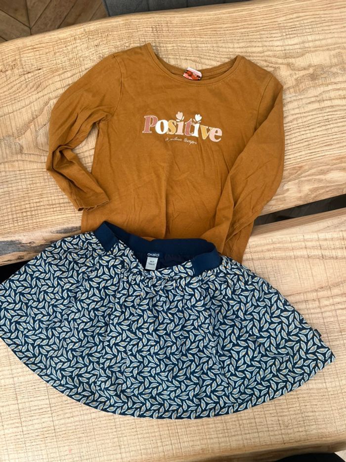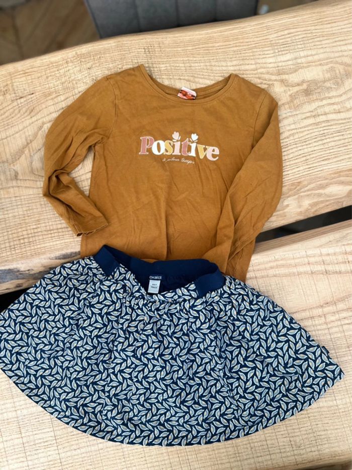 Ensemble en très bon état Gilet cardigan 5 ans in extenso T-shirt manches longues 4 ans tape à l’œil jaune moutarde «  positive  » Jupe doublée okaidi 4 ans à motifs jaune moutarde
