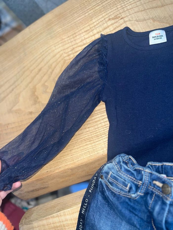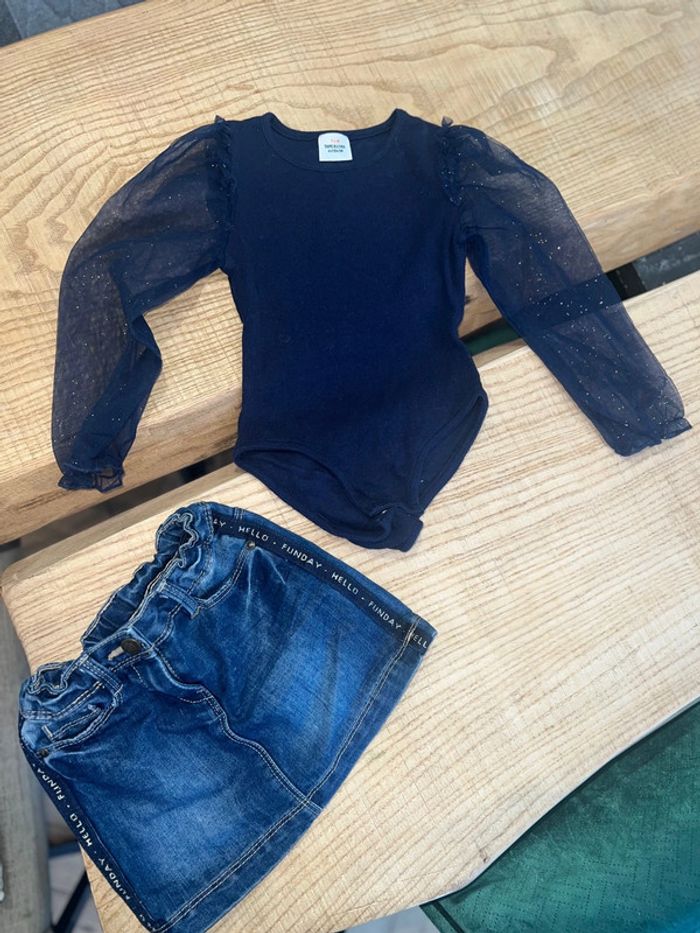 Ensemble tape à l’œil en très bon état Body à paillettes manches en voile à paillettes 4 ans Jupe en jean 3 ans détails dorés Idéal pour les fêtes