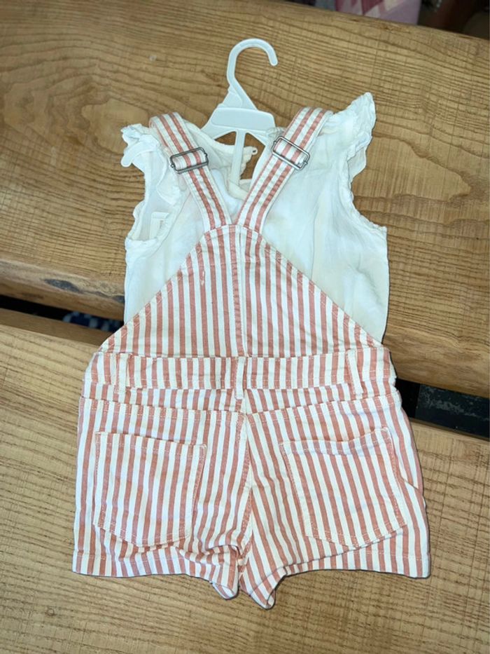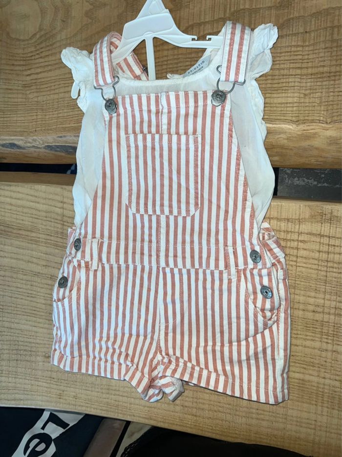 Ensemble fille Primark 5-6 ans Salopette short à rayures corail Blouse blanche à volants légère En très bon état porté une fois