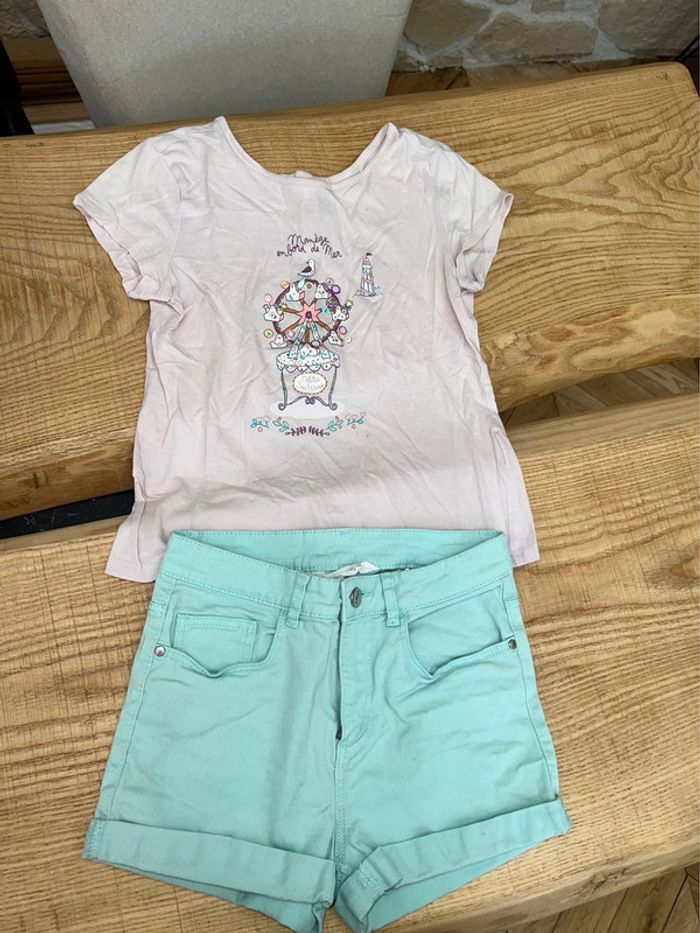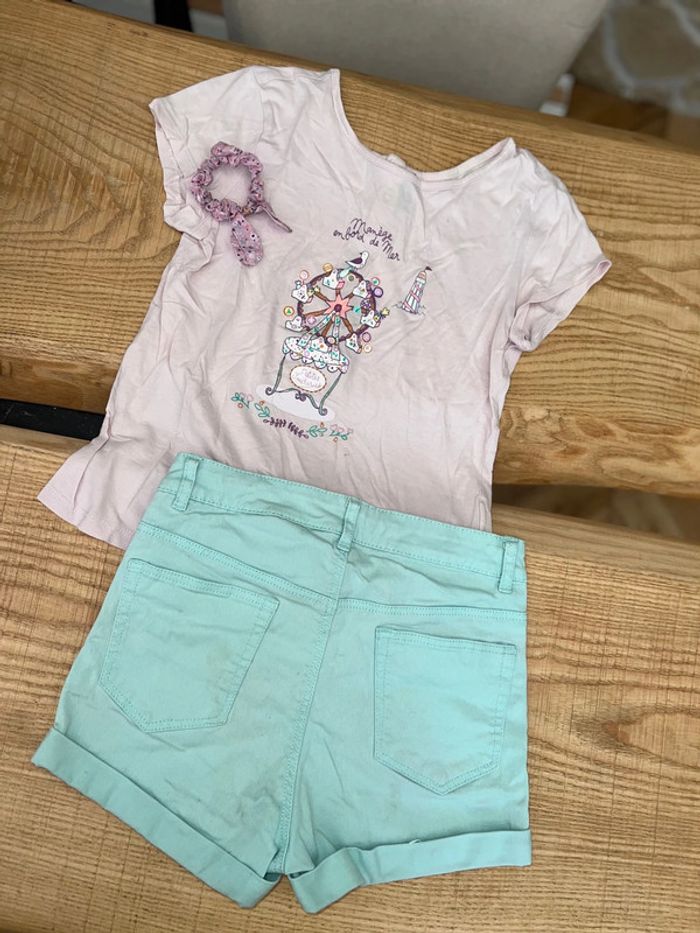 Ensemble sergent major Robe 11 ans en très bon état dos nu Noeud à cheveux bon état T-shirt bon état (une tache voir photo) Short H&M (tache discrète voir photo)