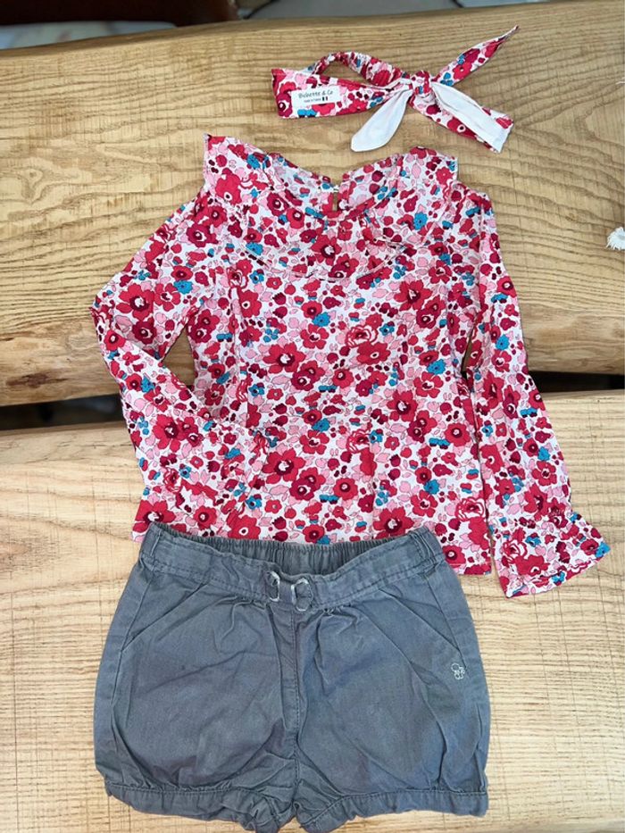Ensemble en très bon état 36 mois Blouse et bandeau Liberty betsy cerise en très bon état (juste boutonnière de la blouse arrière reprise) créatrice bichette & co Short obaibi tbe Même Liberty que celui utilisé par Jacadi