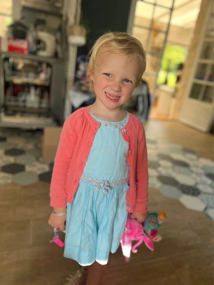 Ensemble Sergent Major 3 ans Gilet corail + robe turquoise Avec détails fleurs Liberty + barrette à cheveux En très bon état