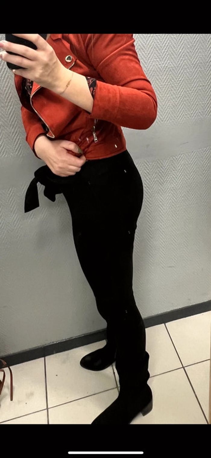 Pantalon taille 36 / 38 Matière toute douce type suédine / daim Très moulant Avec ceinture à la taille (Une couture légèrement défaite sur un des genoux) Acheté en boutique en ligne