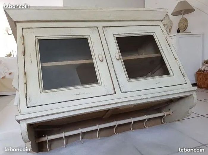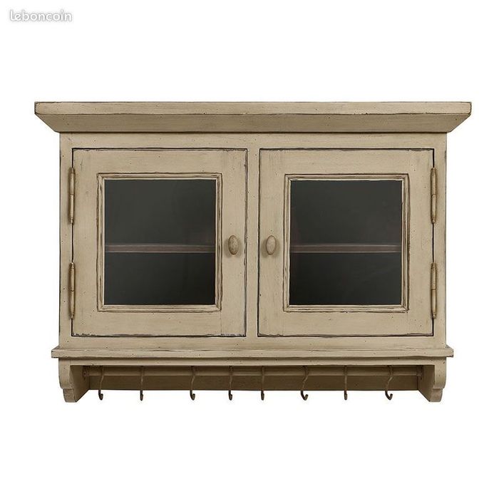 Etat neuf meuble haut de chez Interior’s / Interiors. Il s'agit de la première collection de cette gamme datant de quelques années. Collection Brocante cuisine d’antan, avec style authentique et terroir. Fabrication artisanale. Patine faite à la main, finition grège vieilli. 2 portes vitrées, 1 étagère amovible et réglable sur crémaillère et crochets Dimensions : L 105 x H 75 x P 42 cm. PAS DE LIVRAISON, enlèvement au Plessis Trévise.