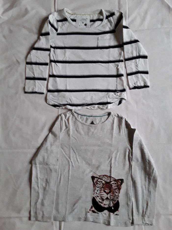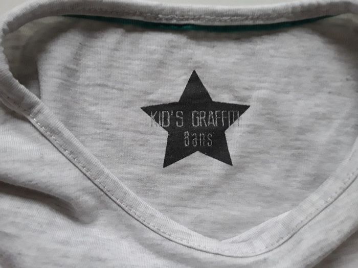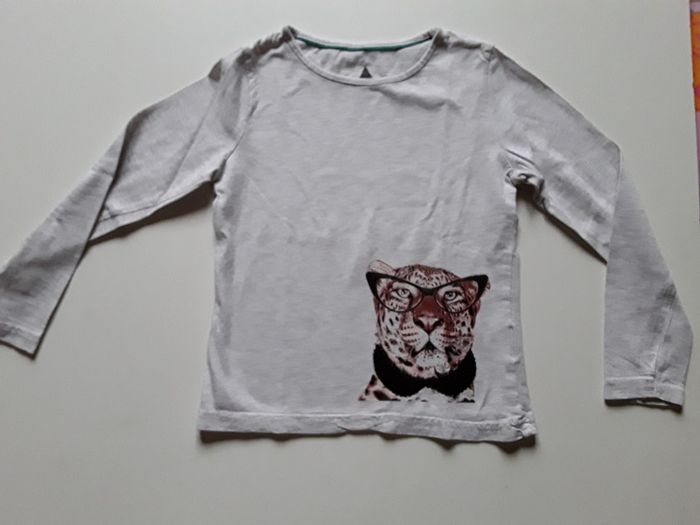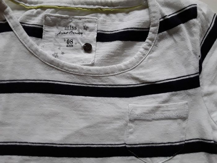 Je vends un lot de 2 T-shirts en taille 8 ans - un t-shirt manches longues avec tête de tigre, marque kid's graffiti, col du tigre à sequins - un t-shirt manches 3/4 à rayures, marques miss avant-première Coutures tournées (voir photo) #cropine_8ans_fille