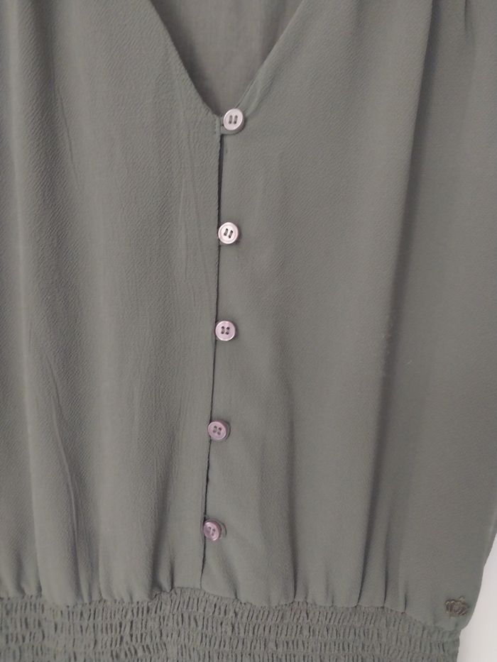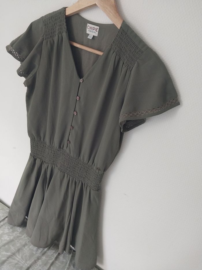 Robe féminine et légère de la marque CHIPIE, couleur kaki intemporelle. Taille indiquée L mais convient mieux à un M (38/40). 💡 Parfaite pour l'été avec son tissu fluide et sa coupe flatteuse ! ✔️ Jolis détails smockés aux épaules et à la taille ✔️ Boutonnée sur le devant ✔️ Manches courtes avec liseré brodé ✔️ Doublée, confortable à porter 📏 Mesures à plat : Aisselle à aisselle : 45 cm Épaule à épaule : 37-38 cm Longueur épaule-bas : 84 cm 📌 Composition : Extérieur : 97% polyester, 3% élasthanne Doublure : 100% coton 🇫🇷 Design français 🟢 Très bon état