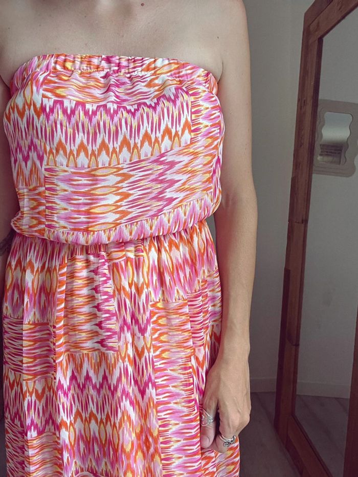 Robe longue bustier Blue Cantrell – Taille S/M Robe longue sans bretelles, au motif ethnique multicolore (rose, orange, blanc). Coupe fluide et confortable, doublée d’un short intérieur intégré. Élastique à la poitrine et à la taille pour un bon maintien. Parfaite pour l’été, légère et originale, à porter aussi bien en vacances qu’en ville. Taille indiquée S/M, convient à un 36/38. ✨ En parfait état. Envoi rapide et soigné 📦 N’hésitez pas à aller voir mon dressing pour faire des lots et économiser sur les frais de port 💌