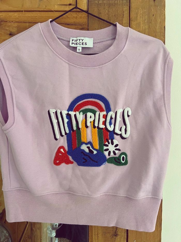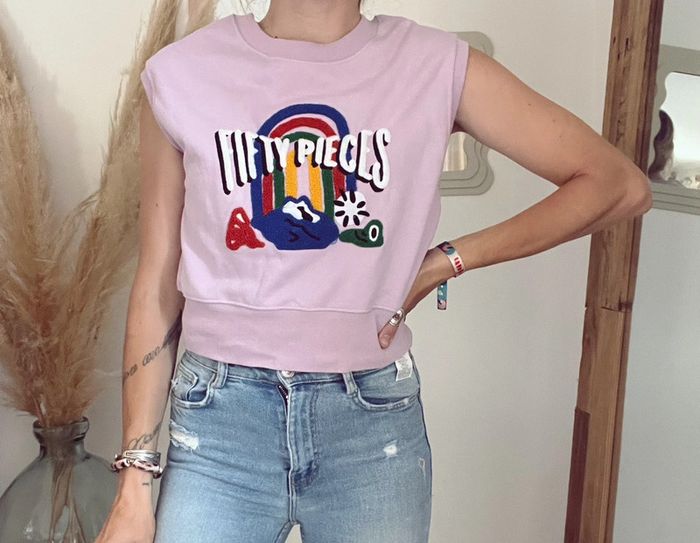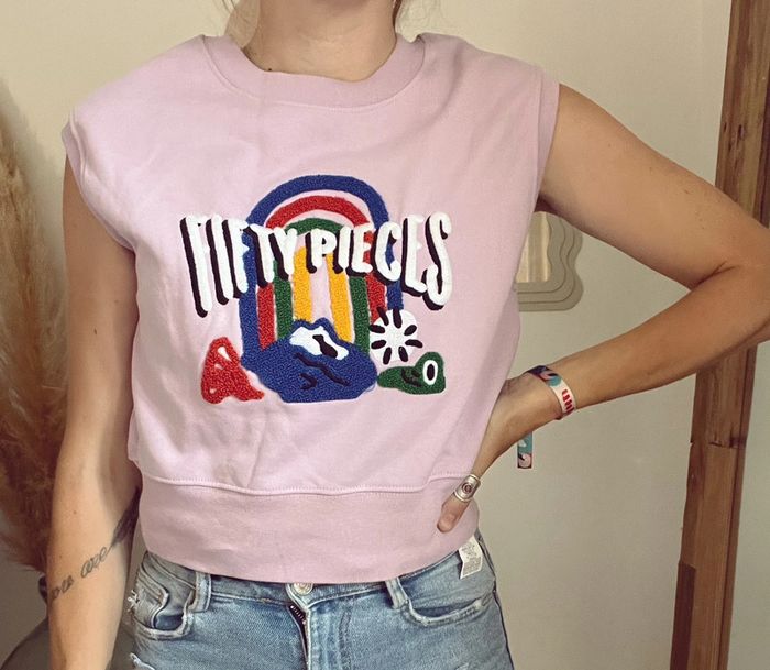 Débardeur matière sweat shirt Lila sans manches de la marque FIFTY PIECES Taille S, convient aussi à un petit M. Matière douce, agréable à porter. Visuel brodé multicolore en relief avec l’inscription « Fifty Pieces » et des motifs originaux (arc-en-ciel, visage, œil, etc.). Coupe courte légèrement loose, esprit streetwear décontracté. 🔸 État : neuf Valeur : 50€ 📦 Envoi rapide et soigné 💌 N’hésitez pas à aller voir mon dressing pour faire des lots et économiser sur les frais de port #fiftypieces #debardierfemme #hautoriginal #modecolorée #streetwearfemme #lookété #hautrose #broderiecolorée #styleurbain #fashionaddict #vintedfrance #lookfemme #tailleS #vêtementtendance #hautfemmeoriginal #vintedlook