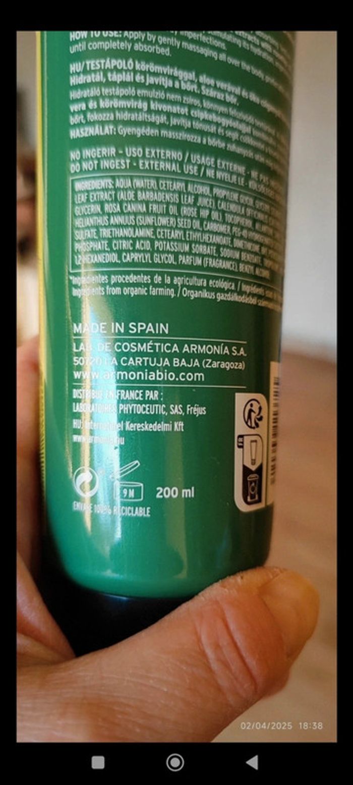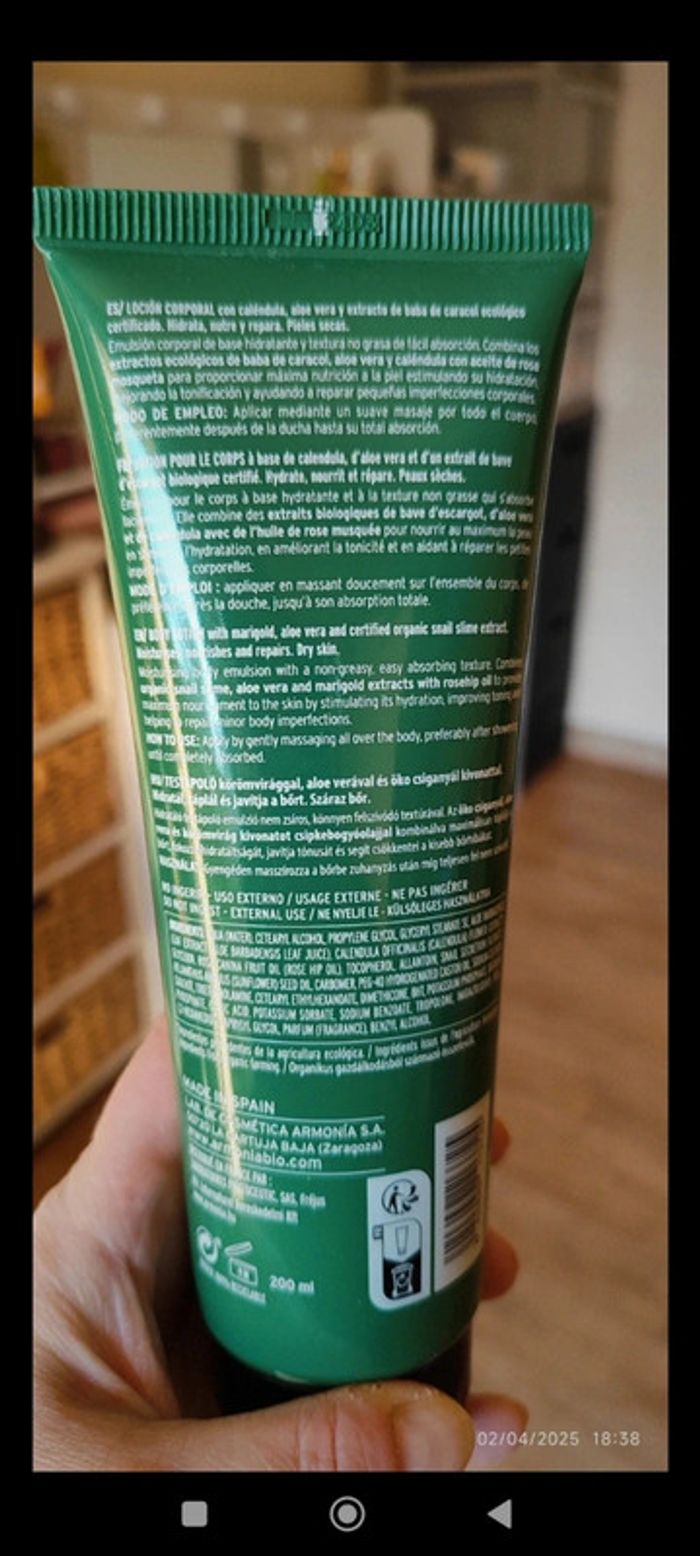 L'extrait de bave d'escargot certifié biologique, spécialement sélectionné par Armonía et obtenu grâce à une méthode d'extraction brevetée, qui garantit sa pureté et sa qualité maximales. Très riche en protéines, qui apportent nutrition, collagène et élastine, qui jouent un rôle déterminant dans la structure et la souplesse de la peau; allantoïne, acide glycolique et mucopolysaccharides, associés à la régénération cellulaire. L'extrait de calendula, émollient riche en vitamines et en sels minéraux qui aident à adoucir la peau et l'extrait d'aloe vera, connu pour sa capacité réparatrice, est un principe actif extrêmement utile pour calmer, rafraîchir et améliorer l'apparence de la peau, capable de conserver de grandes quantités d'eau