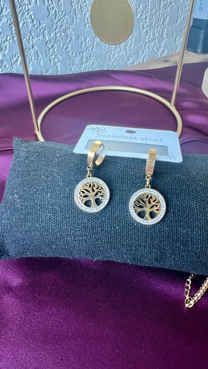 Ensemble de bijoux arbre de vie an acier inoxydable bagues gourmette ajustables collier et boucle strassés possibilité bague à breloque ou normal dessiné au choix à composé neuf 7€ pièce