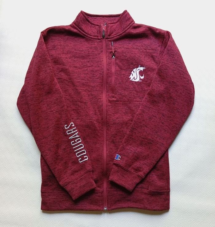 Veste Zippée Champion Pour Femme ou Homme Cougars Washington State University Couleur Rouge Bordeaux avec détails en noir Logo Cougars brodé dans la manche droite Taille S Une poche a fermeture éclair dans la poitrine Deux poches latérales En très bon état
