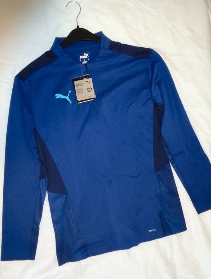Sweat-shirt Puma Taille M Couleur Bleu Avec étiquette CARACTÉRISTIQUES + AVANTAGES -dryCELL : technologie PUMA dont les propriétés d’évacuation de l’humidité assurent confort et fraîcheur durables Contient des matières recyclées : fabriqué à partir de fibres recyclées. DÉTAILS Slim Fit Col à fermeture zippée courte invisible Inserts en colour block ton sur ton Inserts avec motifs dynamiques sur les épaules et les avant-bras Logo PUMA CAT sur la droite de la poitrine