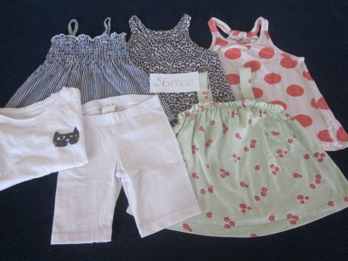 36 mois, 4 hauts sans manche/bretelles + haut mc + legging court, kiabi, palomino