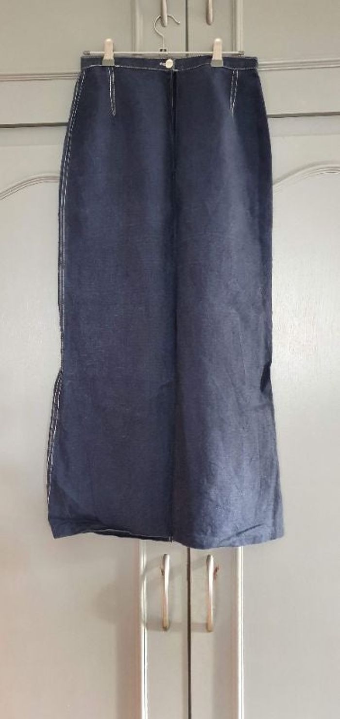 Superbe jupe longue En lin Surpiqures fantaisie sur le devant, tout le long de la jupe de côté, sur les deux poches et à la fente Belle fente de 41 cm env pour l'aisance Boutons et fermeture éclair Taillé 2 Mesures de la taille 33 cm Longueur 89 cm