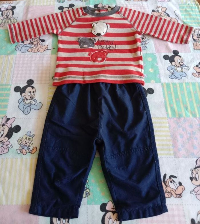 Ensemble en bon état composé : ➡️ 1 pull fin ⚠️ quelques bouloches ⚠️ Couleur: rouge/ gris 62% coton/ 38% polyester ➡️ 1 pantalon taille élastique Couleur : bleu marine 100% polyester / doublure : 100% coton Taille: 6 mois