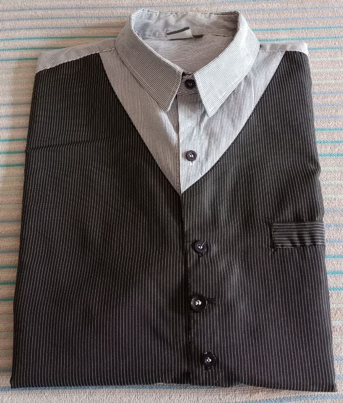 Chemise manches longues en bon état Poche au niveau de la poitrine Largeur à plat sous aisselle : 54 cm Longueur : 74 cm Couleur: noir/ bleu/ blanc Motifs : rayures Taille: L ⚠️ Quelques bouloches dû au lavage ⚠️