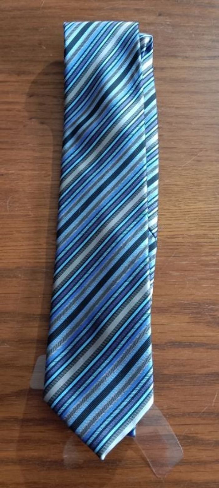 Cravate en très bon état ( neuve) Longueur: 144,5 cm Largeur : 8,5 cm Couleur : bleu/ violet/gris Motifs : rayures 100% polyester Marque : Yves Dorsey