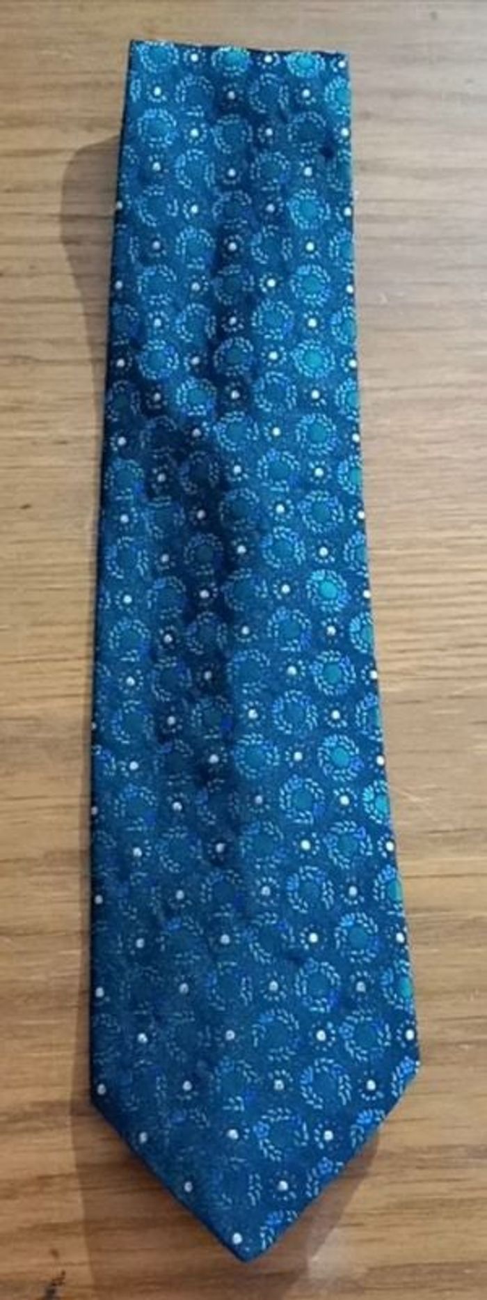Cravate en très bon état Longueur: 135 cm Largeur : 8,5 cm Couleur : bleu marine / bleu canard/ turquoise Motifs : rond+ fleurs 85% polyester / 15% viscose