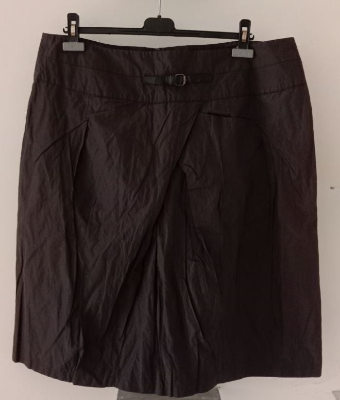 Jupe en très bon état 55% coton/ 40% polyester/ 5% fibres métalliques Doublure : 100% polyester Largeur à plat taille : 51 cm Longueur totale : 63 cm Couleur : gris foncé Taille 48