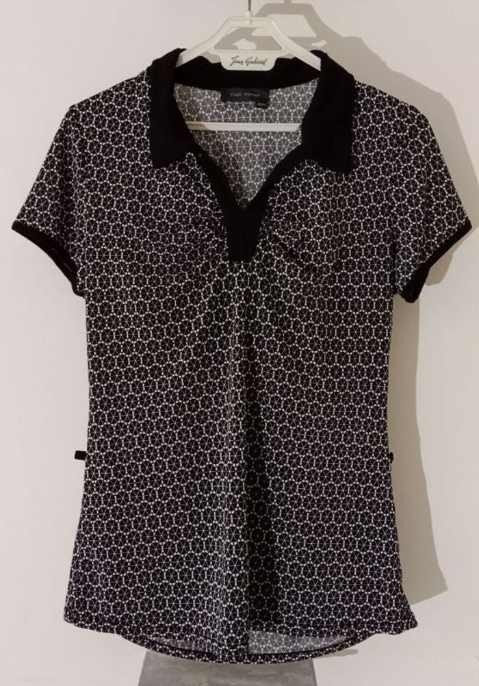 Tee-shirt en bon état Col en V 95% polyester/ 5% elasthanne Largeur à plat sous aisselles : 46cm Couleur : noir/blanc Taille 42/44