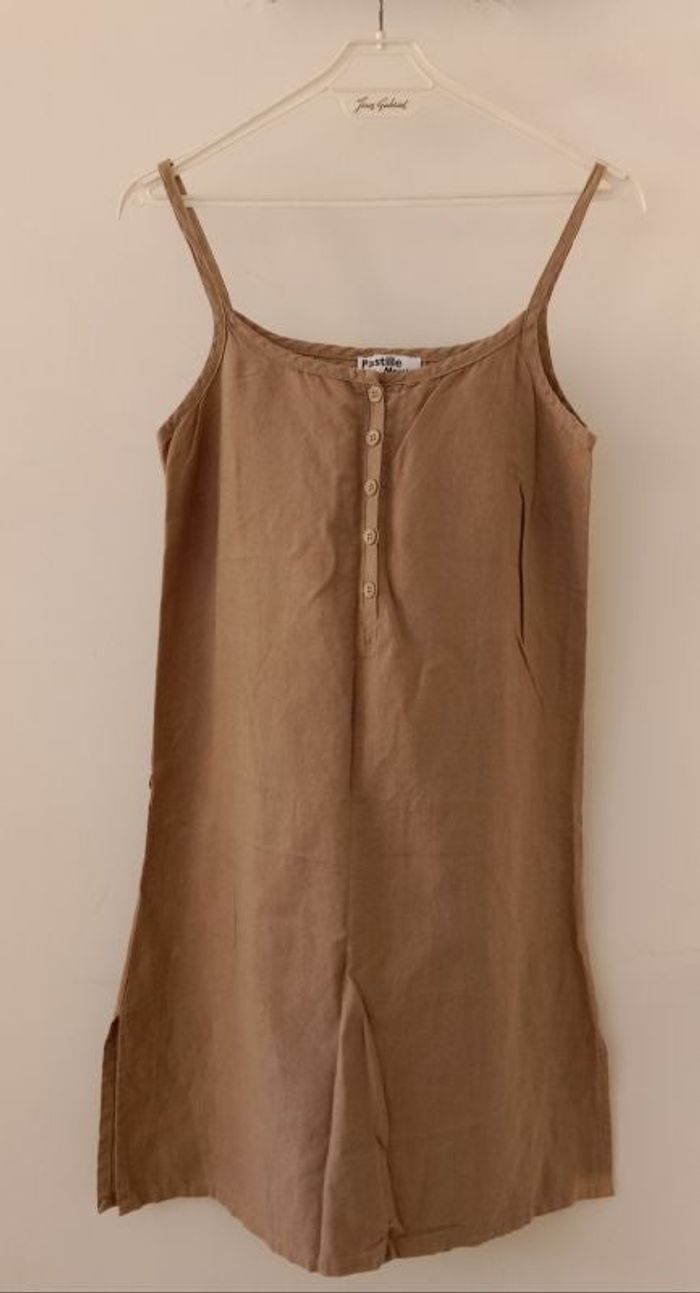 Tunique en bon état. Fines bretelles 55% lin/ 45% coton Largeur à plat sous aisselles : 43,5 Longueur totale : 76 cm Couleur: beige Taille 40