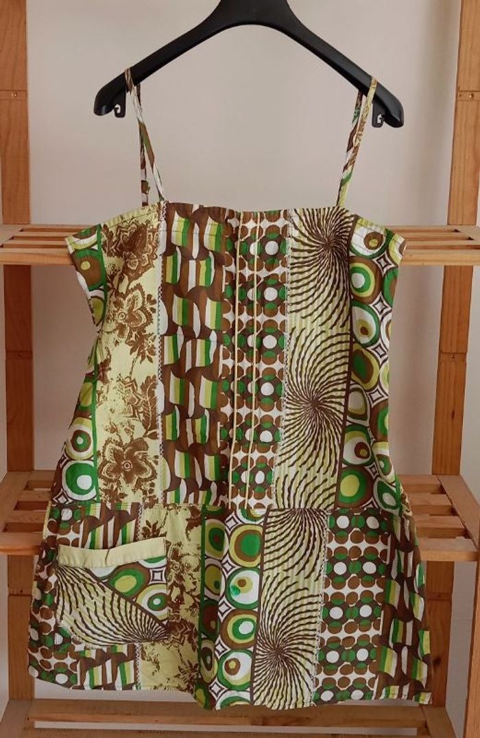 Haut en très bon état 100% coton Fines bretelles réglables Fermeture sur le côté Largeur sous aisselles : 43 cm Couleur : vert/brun Taille 40