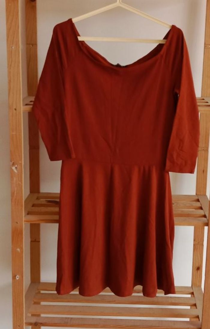 Robe en bon état. Manches mi -longues Légèrement évasée 96% coton/ 4% elasthanne Largeur sous aisselles : 42 cm Longueur totale : 88 cm Couleur : marron chaud Taille L équivalent taille 40