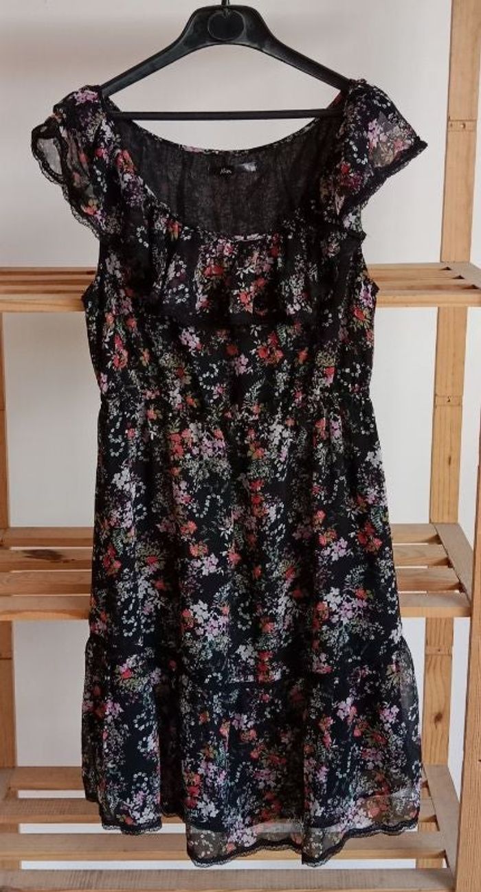 Robe en état satisfaisant 100% polyester Sans manche Légère Largeur sous aisselle 37 cm Longueur totale : 89 cm Couleur : noir avec motifs floraux multicolores Taille 38