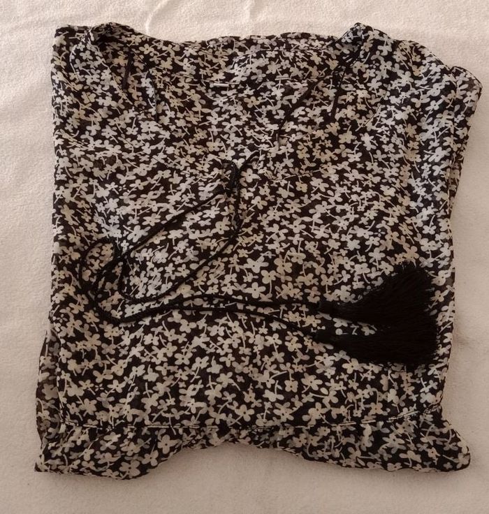 Blouse en très bon état Matière légère et fluide Col en V Manches 3/4 ⚠️ Transparent ⚠️ 100% polyester Largeur à plat sous aisselles : 47 cm Couleur : noir / blanc avec motifs fleurs Taille 38
