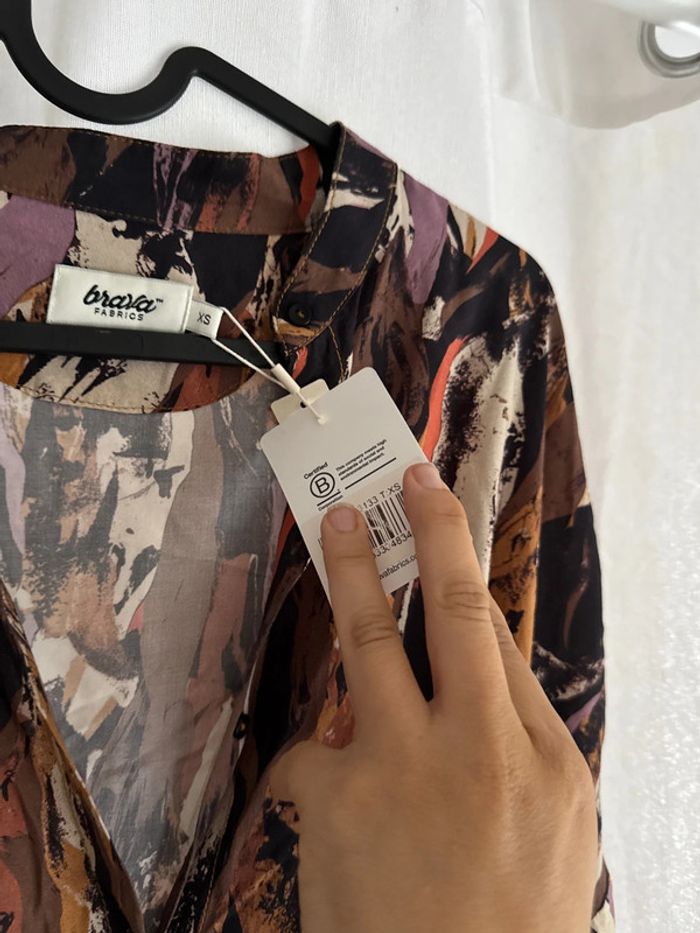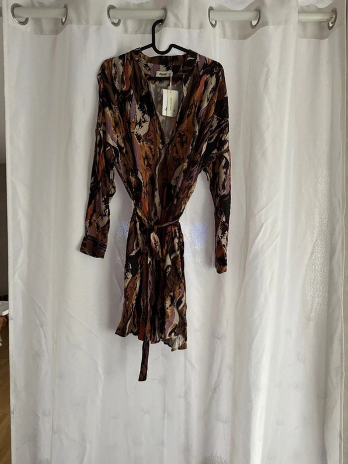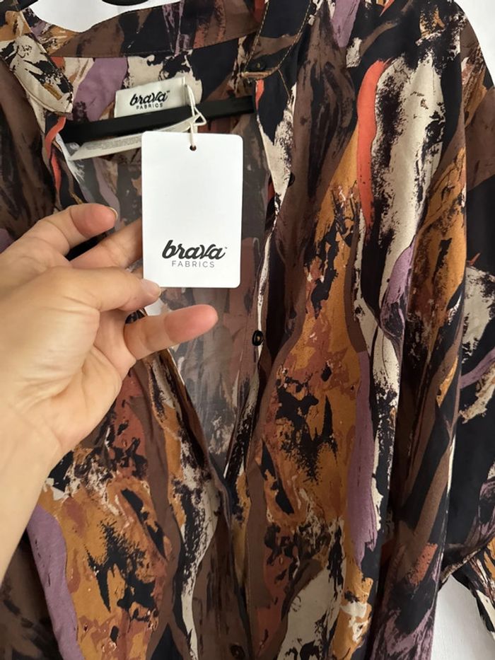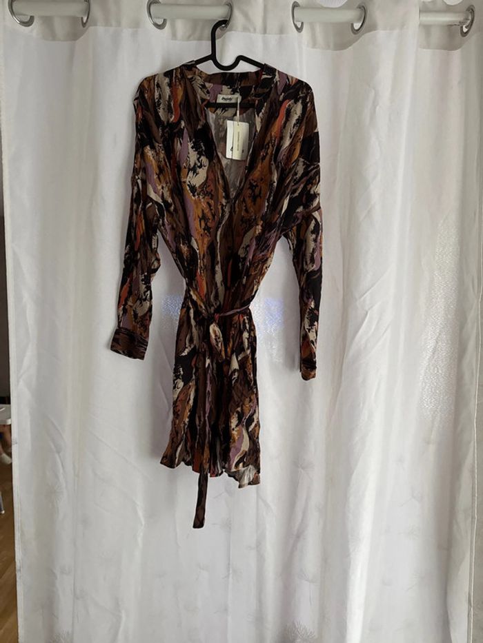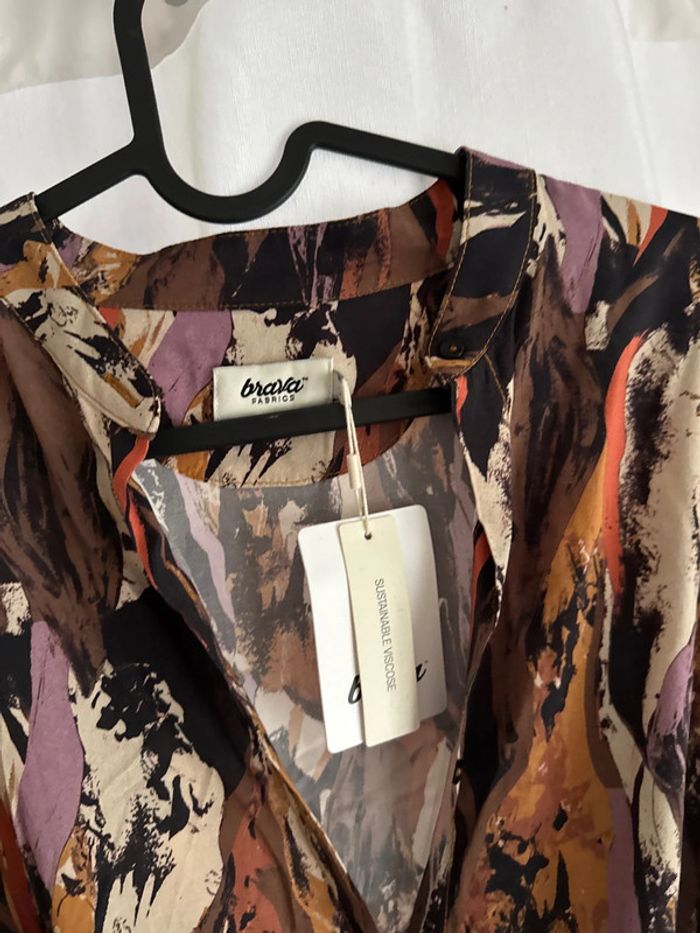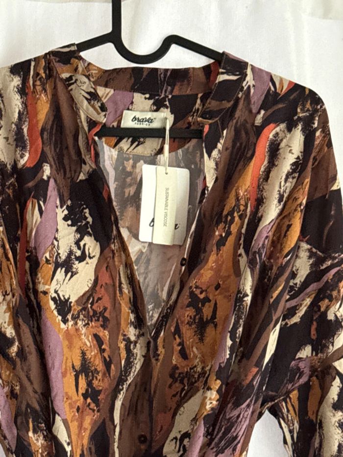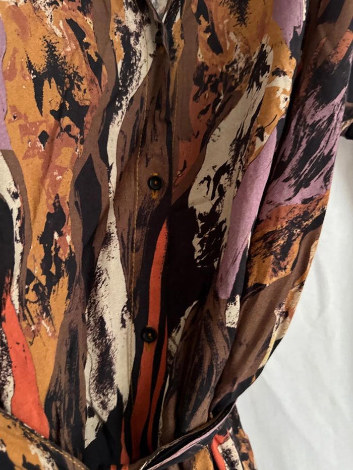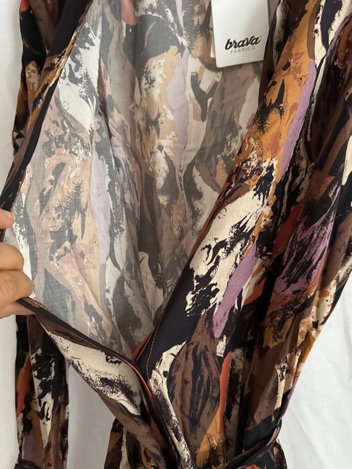 Coupe : Coupe ample , oversize Forme du col : Col mao Motif / Couleur : Motifs abstraits marron et ocre Longueur des manches : Manches longues Informations additionnelles : Poches fonctionnelles latérales, ceinture