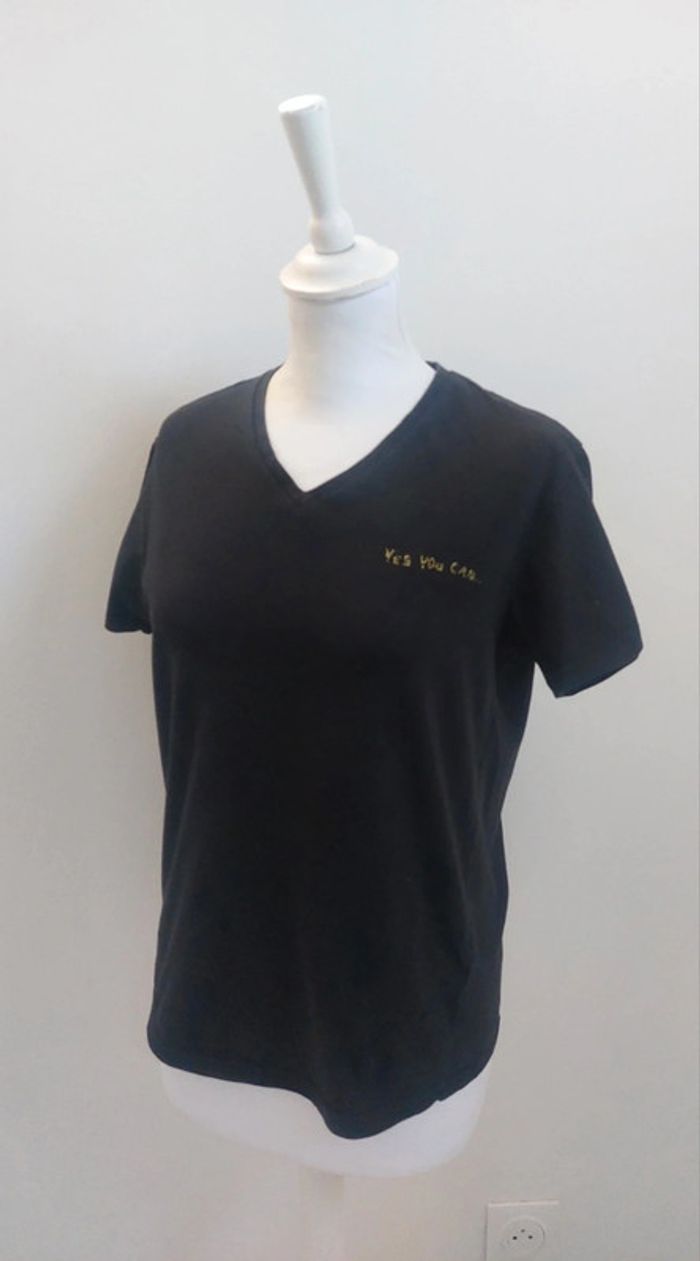 T-shirt col v manches courtes noir écriture doré brodé Yes You Can - photo numéro 1