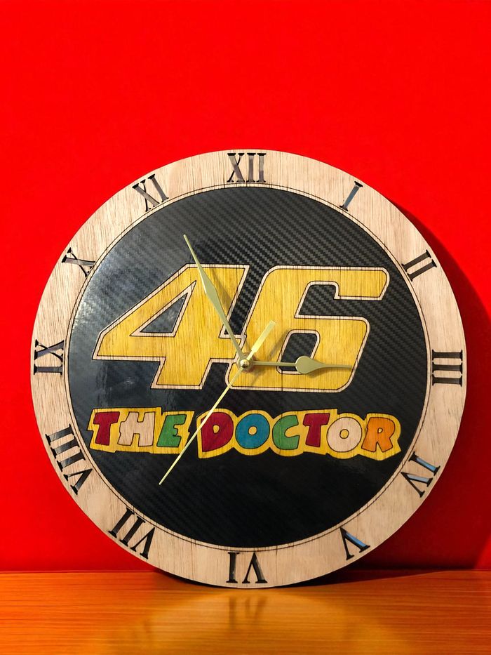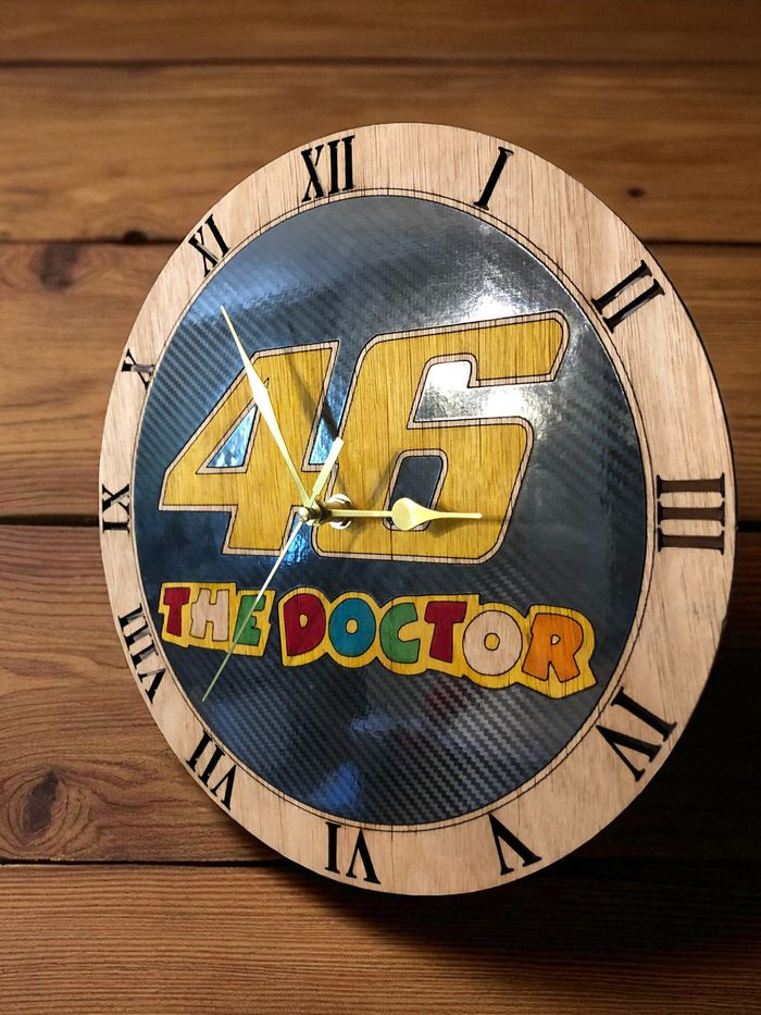 Horloge Valentino Rossi 46 en bois neuve avec mécanisme silencieux, diamètre 29 cm, finition adhésif carbon.