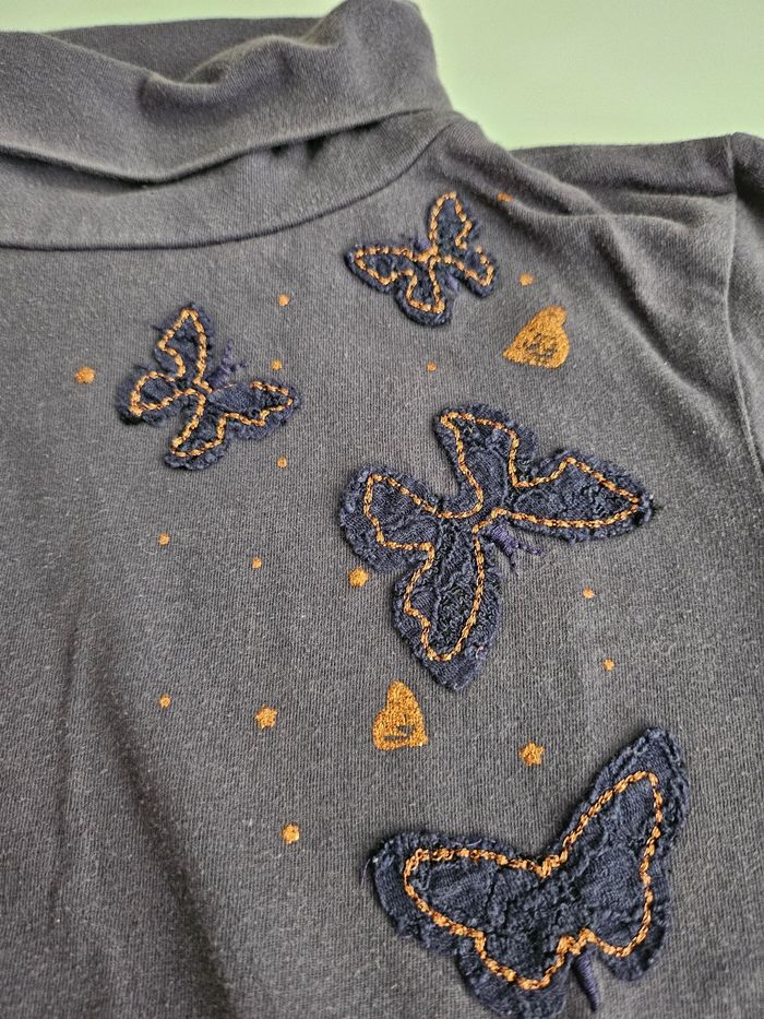 Sous pull col roulé violet avec broderies papillon et cœur devant. Marque : Gemo Taille : 8 ans