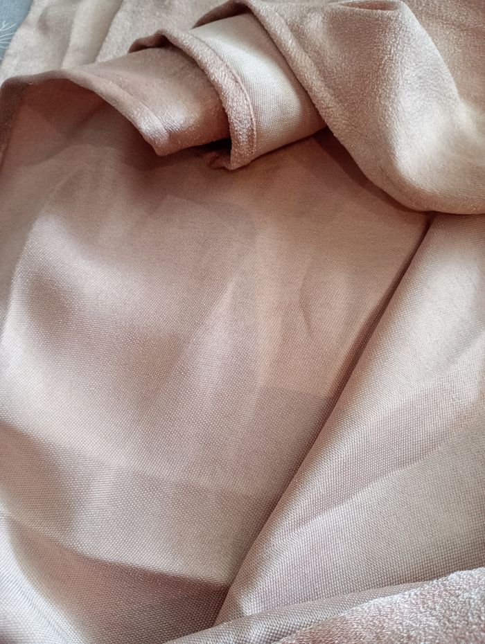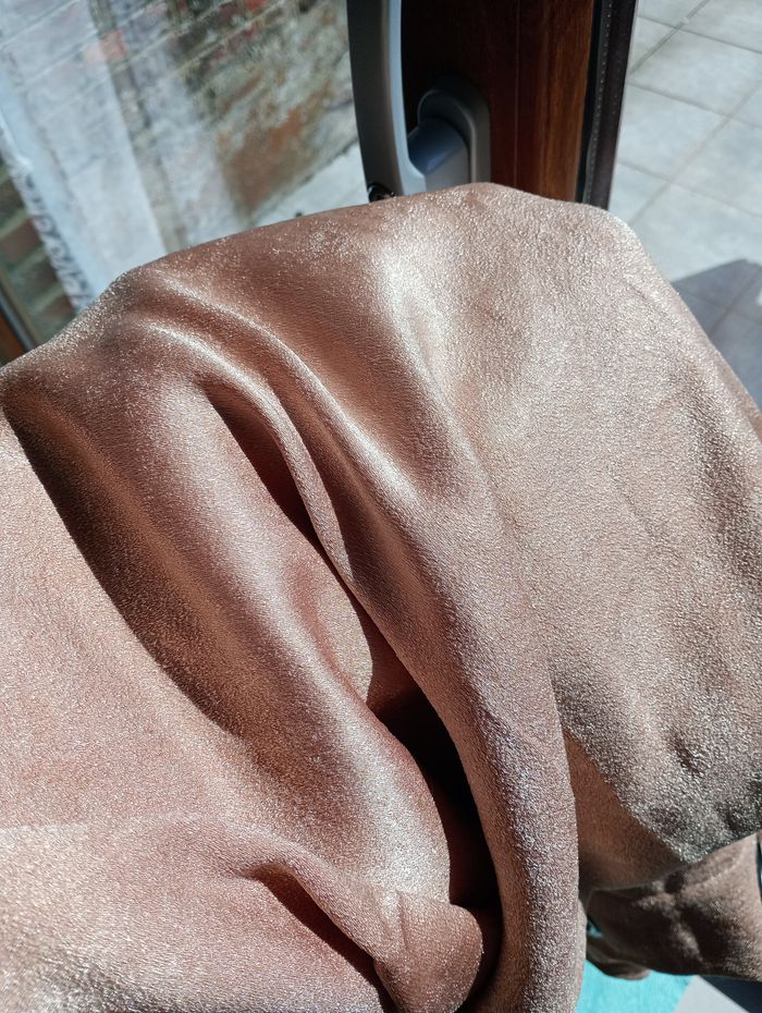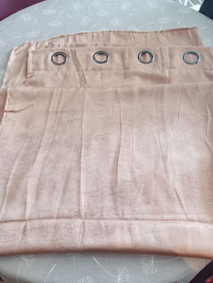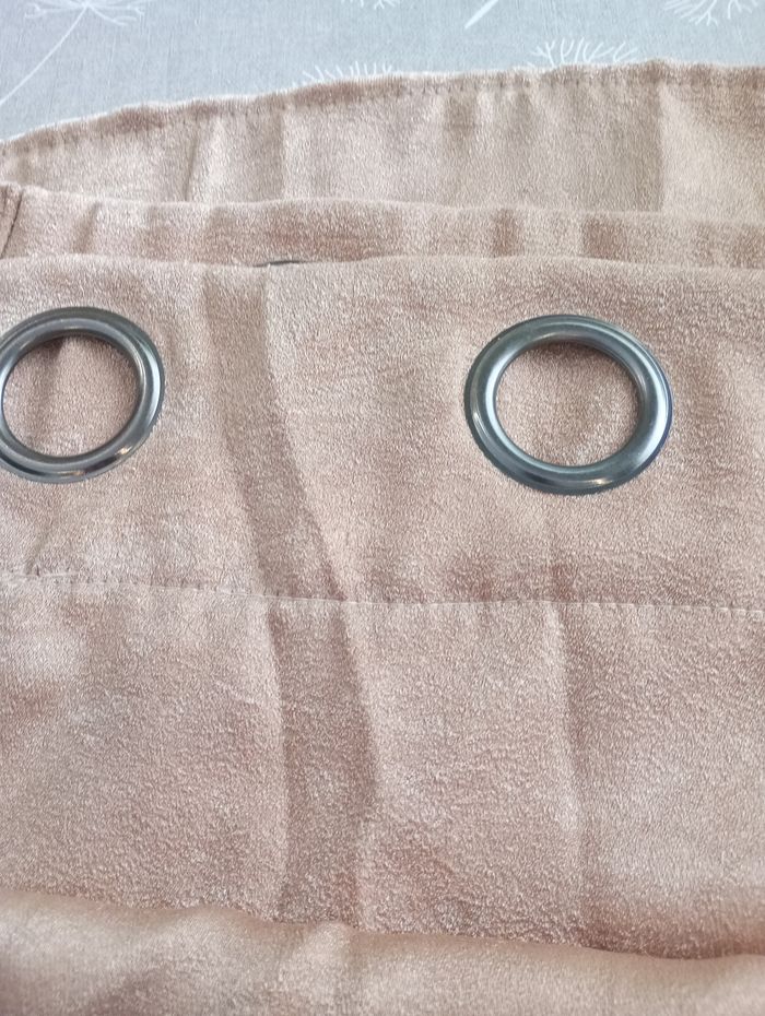 Rideau couleur doré-rose (comme sur la dernière photo). Légèrement irisé. Avec œillets. Touché peau de pêche. Longueur : 245 cm. Largeur : 135 cm. Très bon état.