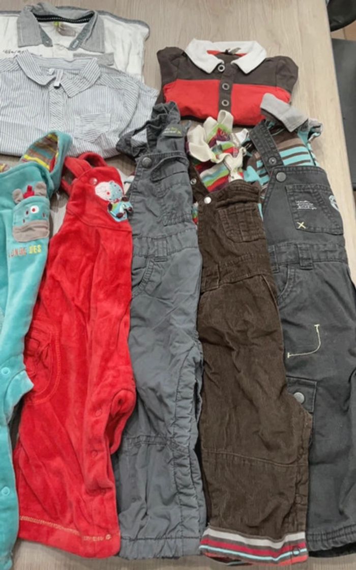 Lot 17 vêtements Orchestra en 9 mois: 1 pull, 1 pull sans manches, 1 gilet, 3 pantalons, 2 chemises, 1 bodies, 5 salopette, 2 tee shirts manches longues.