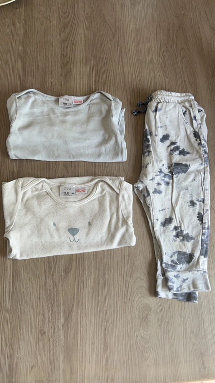 Lot de 4 vêtements Zara 18/24 moi. 2 bodies mabches longues+ 1 pantalon + 1 gilet