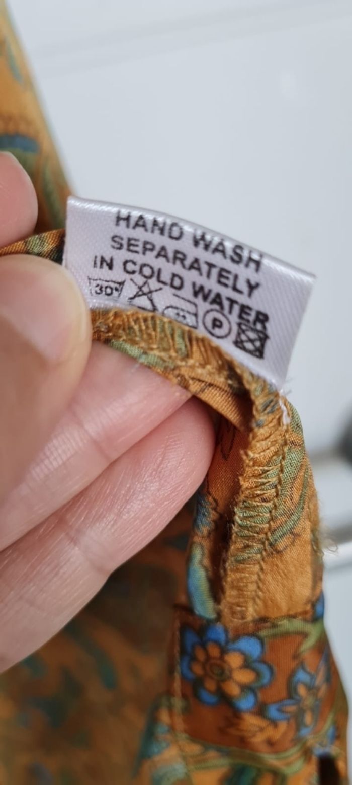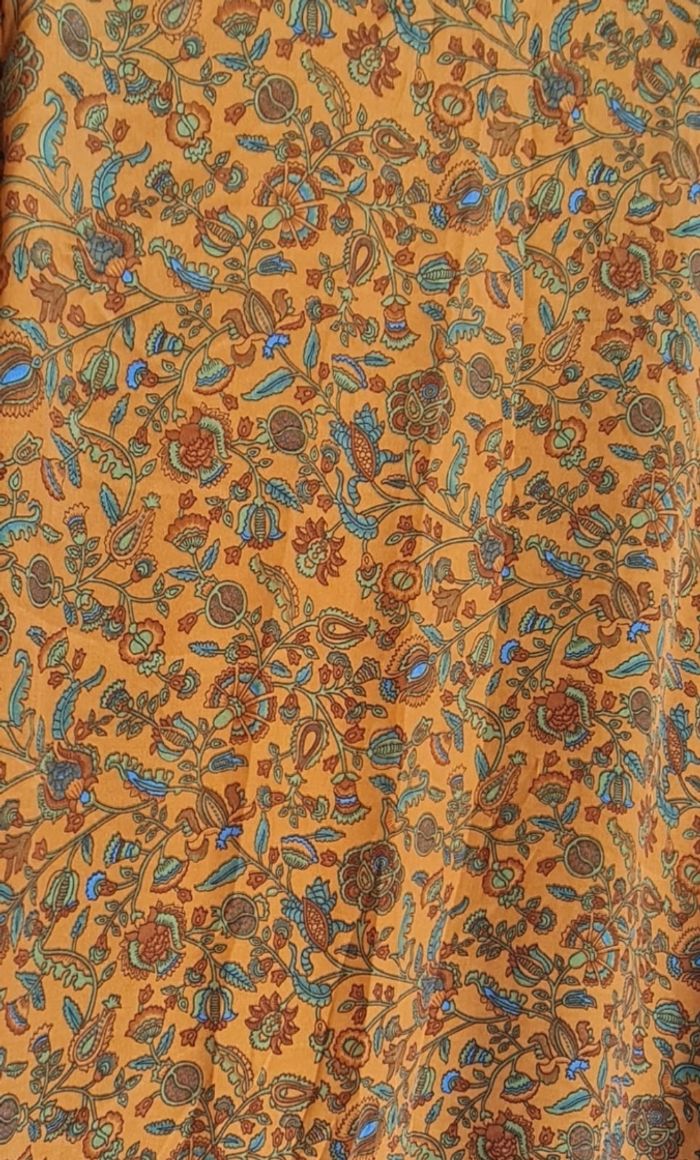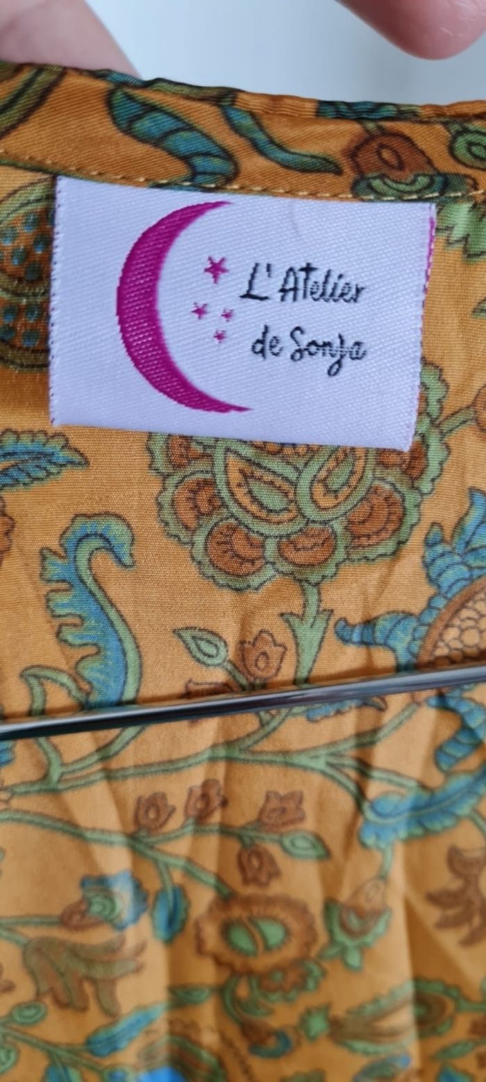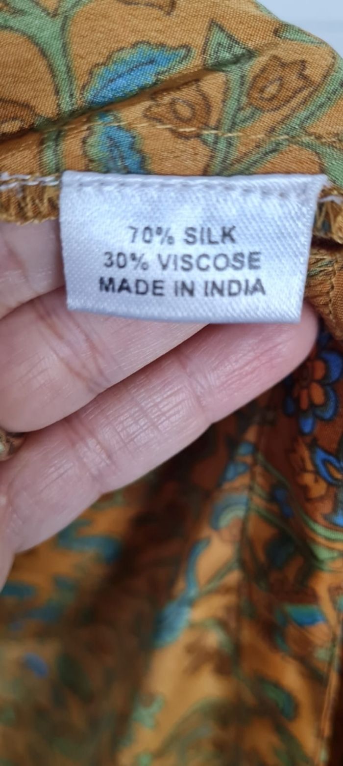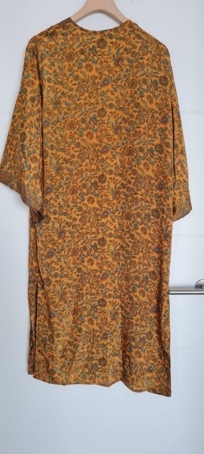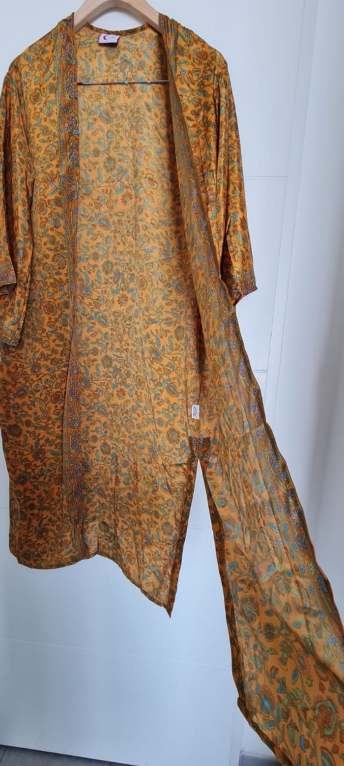 Kimono long fluide et agréable à porter, en soie indienne ( 70 % ) et viscose ( 30 % ) . Le kimono se porte à la plage , en journée avec un short ou pantalon, en soirée pour ajouter une touche d'élégance et à la maison en robe d'intérieur. taille L , marque l'atelier de sonja , en très bon état.