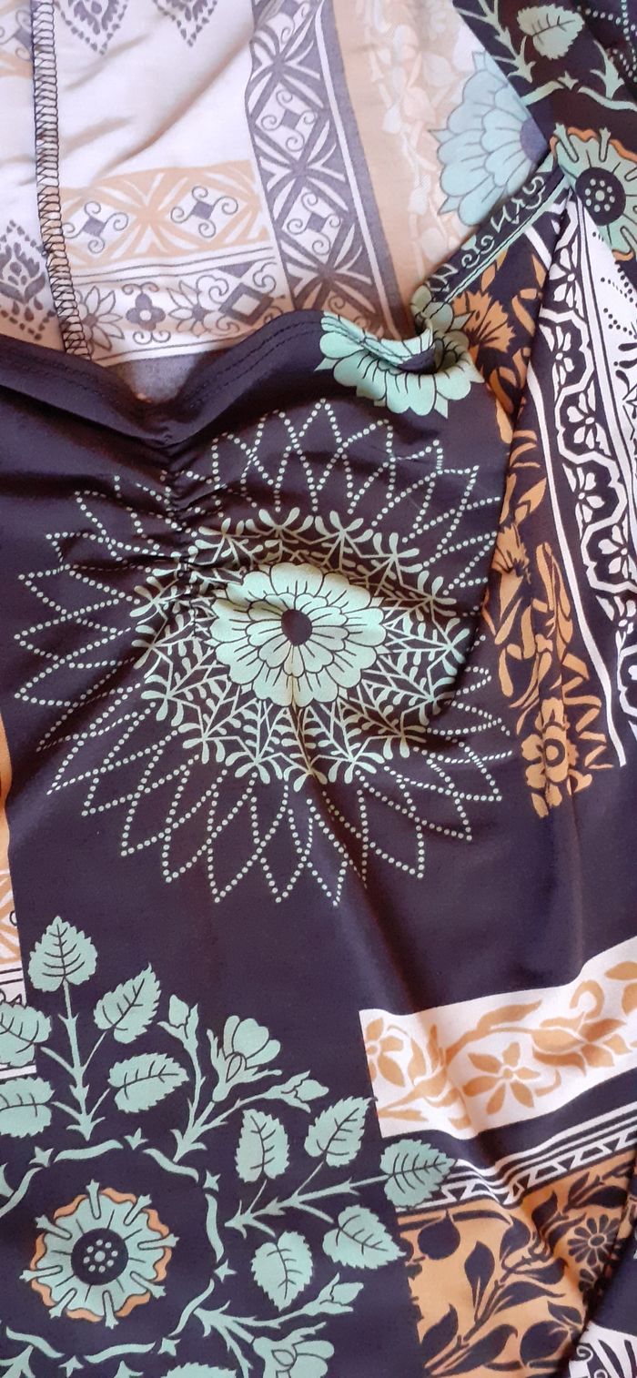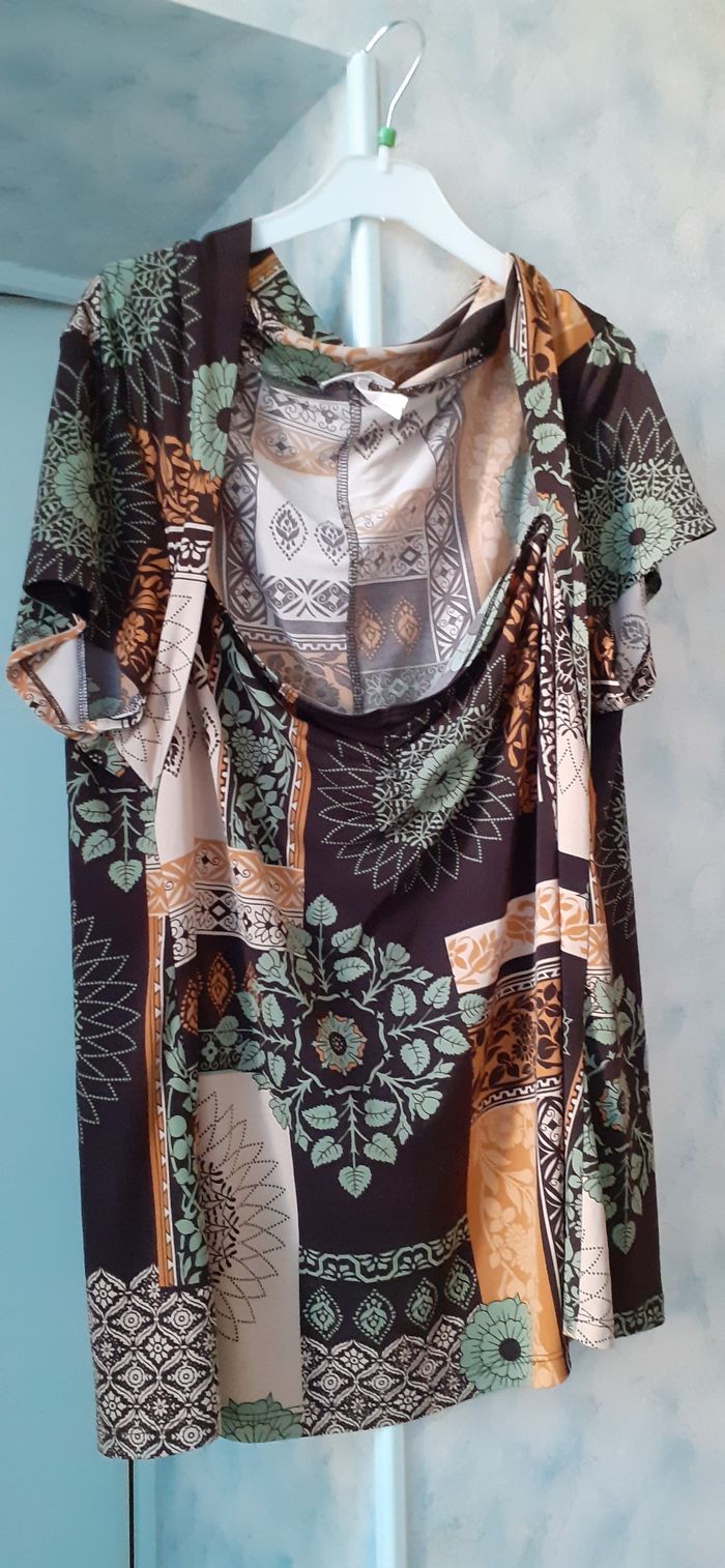 Vends un top long en polyester, encolure drapée, couleur marron, vert et orange, marque Level Eight Plus, taille 50. Longueur dans le dos : 73 cm. Largeur aisselle à aisselle : 57 cm.