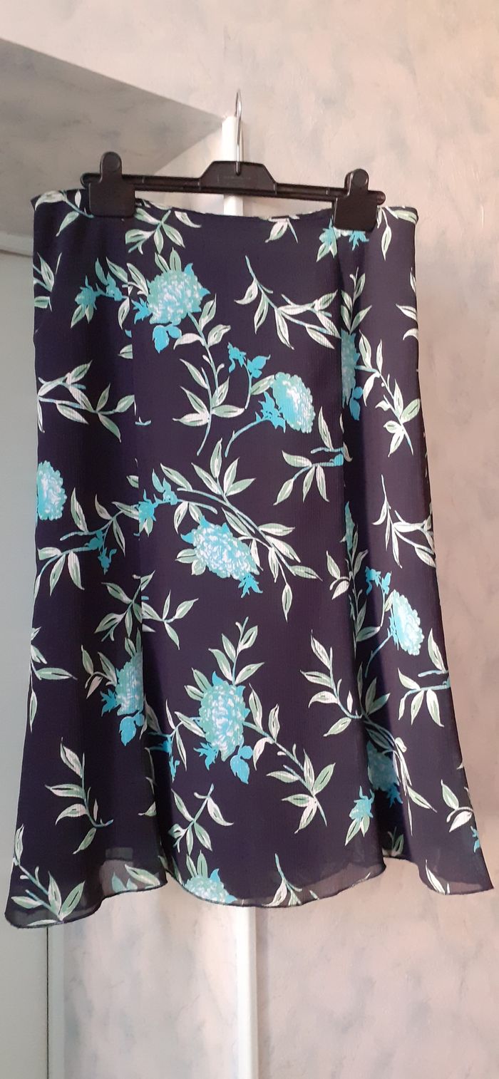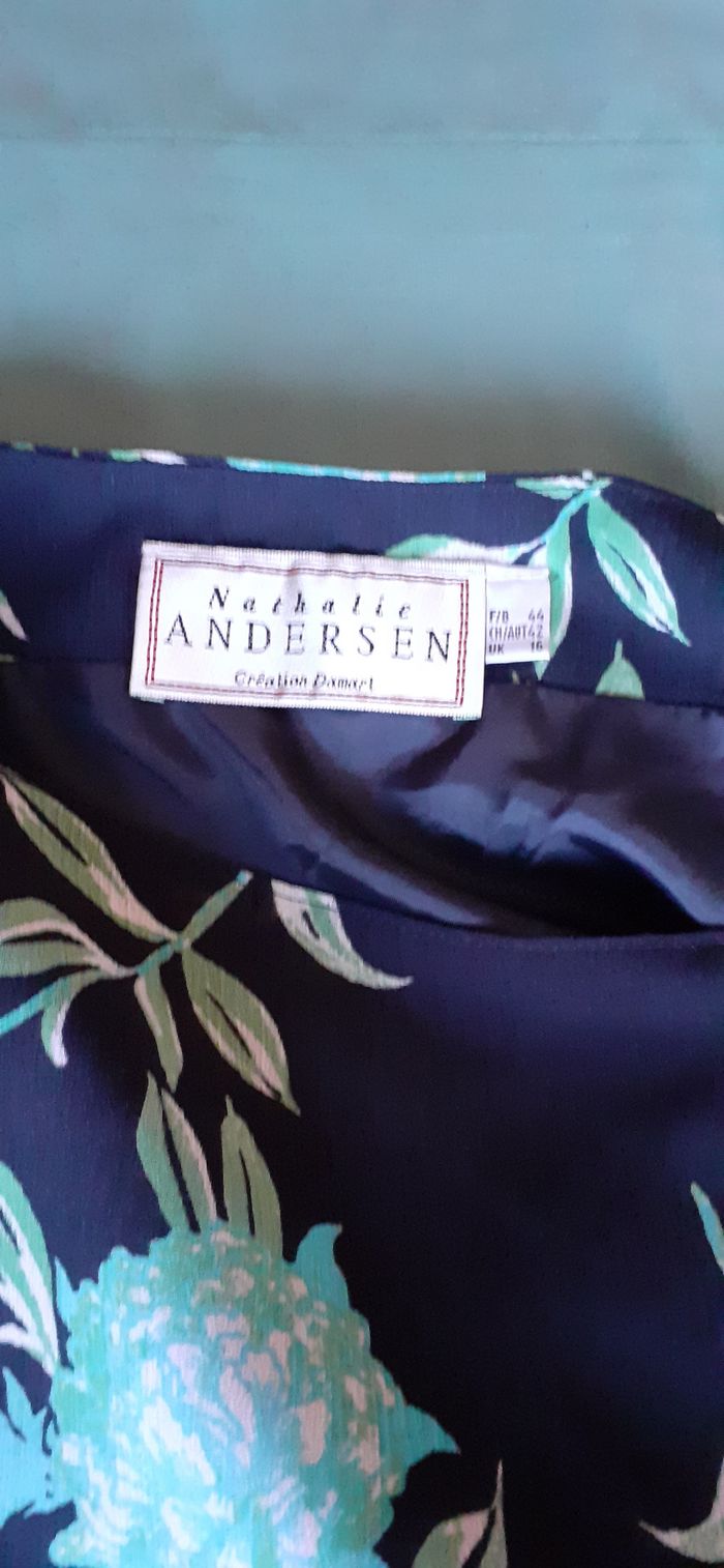 Vends une jupe 100 % polyester de forme évasée, ceinture non extensible, fermeture éclair sur un côté, couleur bleu marine avec feuillages vert et bleu clair, marque Andersen (Damart), taille 44. Longueur : 70 cm Largeur ceinture à plat : 42 cm.