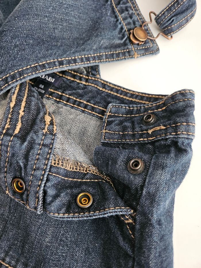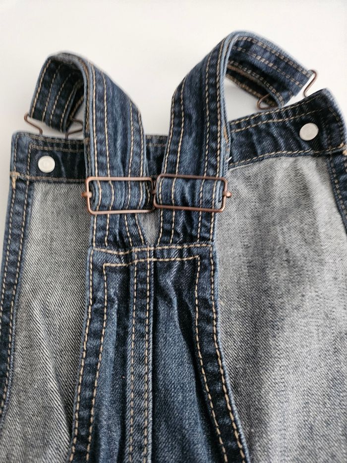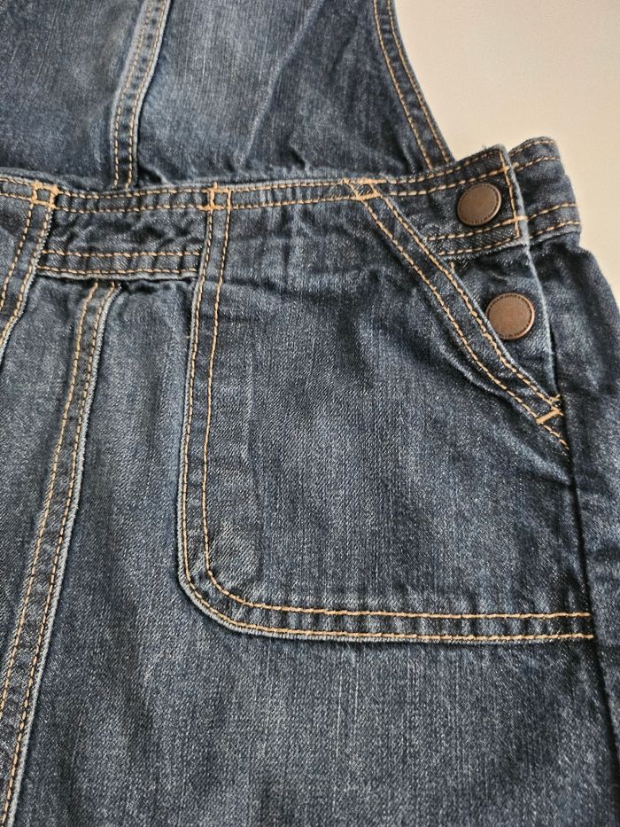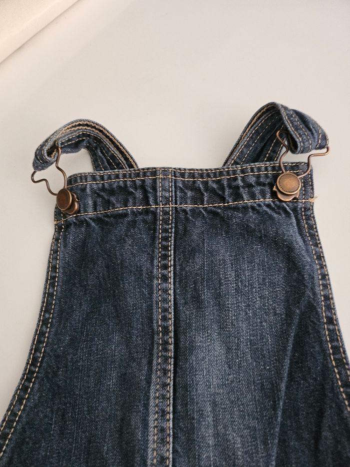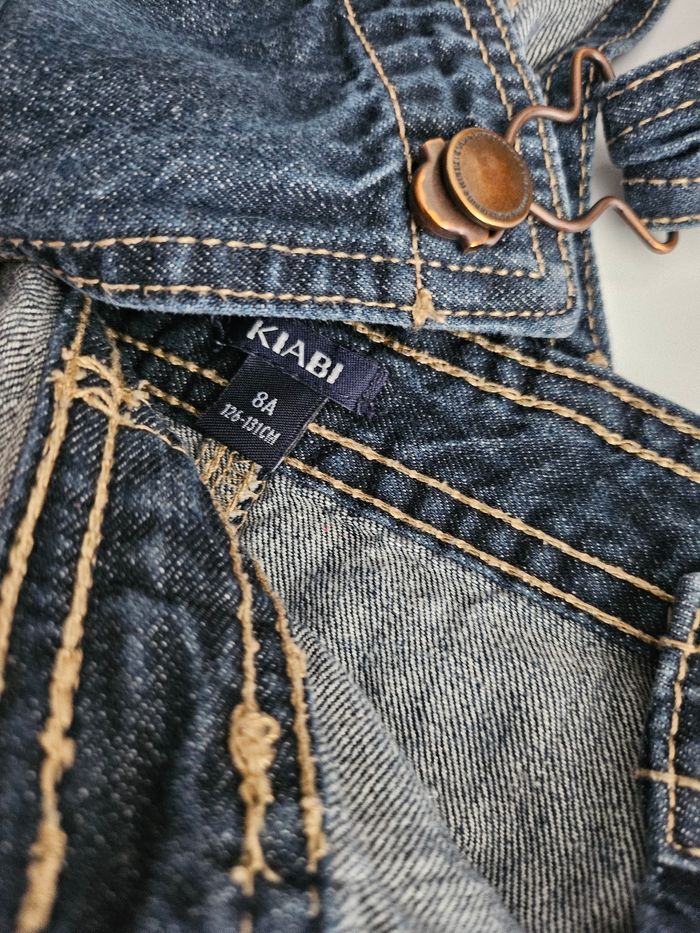 Robe en jean bleu. Bretelles réglables. Deux pressions sur le côté. Deux poches devant. Marque : Kiabi Taille : 8 ans
