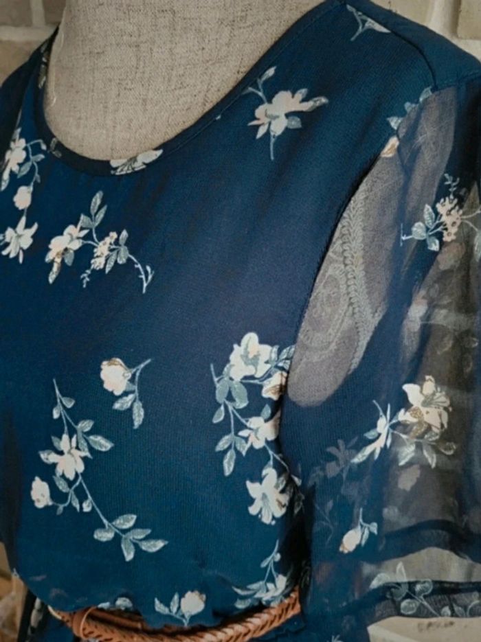 💝 Bénéficiez d'une réduction en créant lot dans mon dressing 🛍️ 🌸 Robe mi longue Vero Moda en parfait état, portée 2 fois 🎀 Voile bleu marine avec un bel imprimé fleuri de couleur vert sauge, blanc et rose entièrement Doublé sauf aux manches pour les laisser vaporeuses 🪷 Coupe évasée et fluide 🍥 Taille XS 34 🩷 Un style chic et romantique à porter en toutes simplicité ou avec une ceinture pour marquer la taille (non incluse)