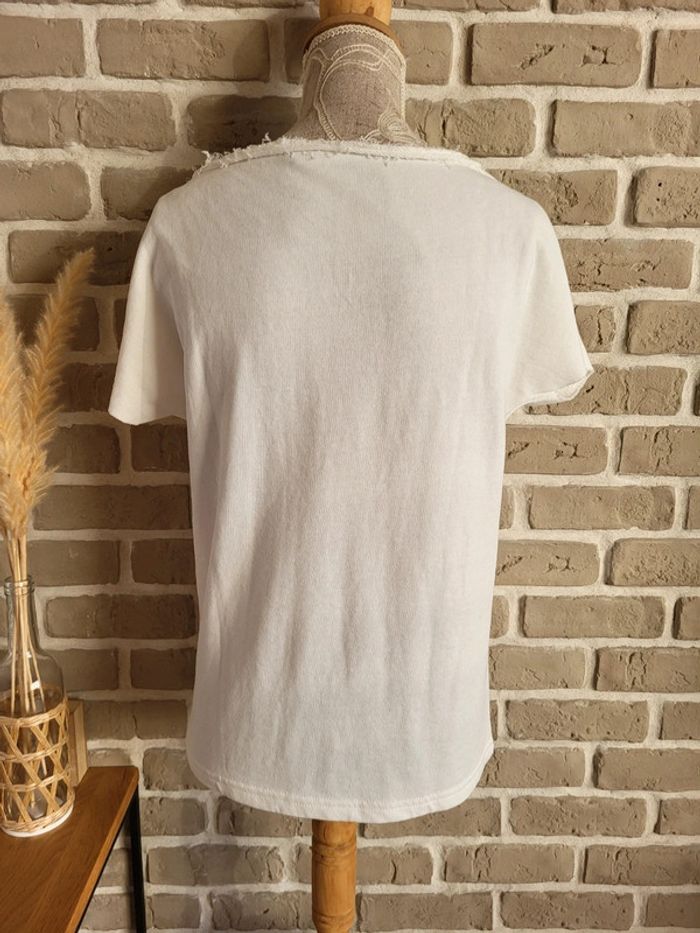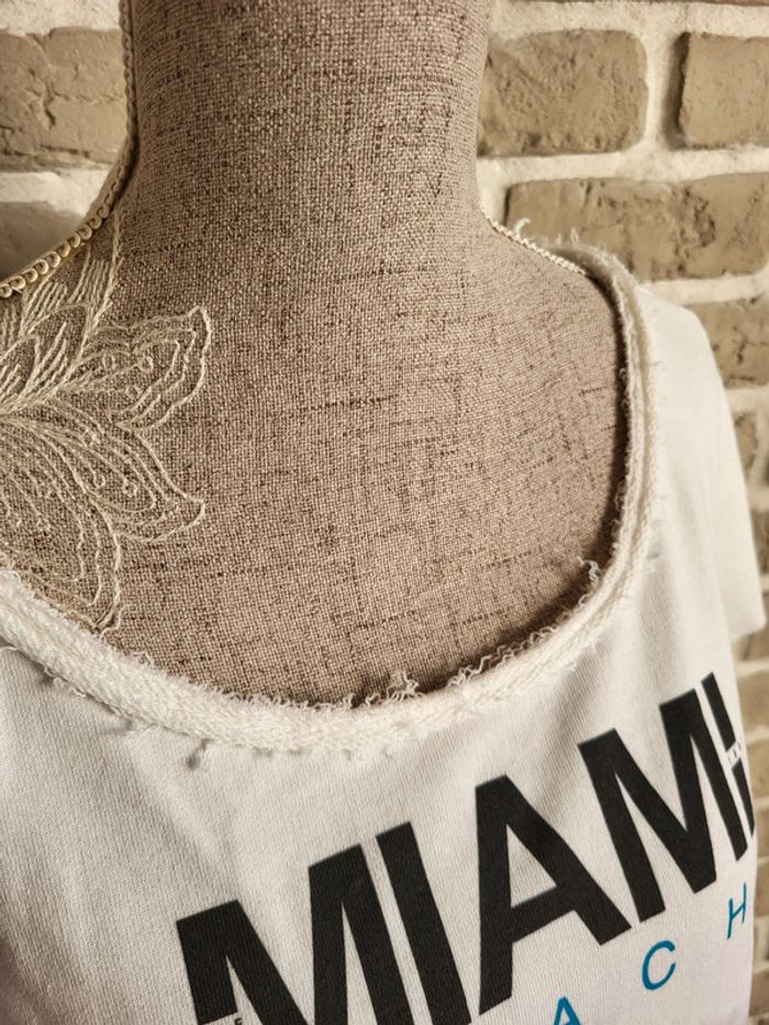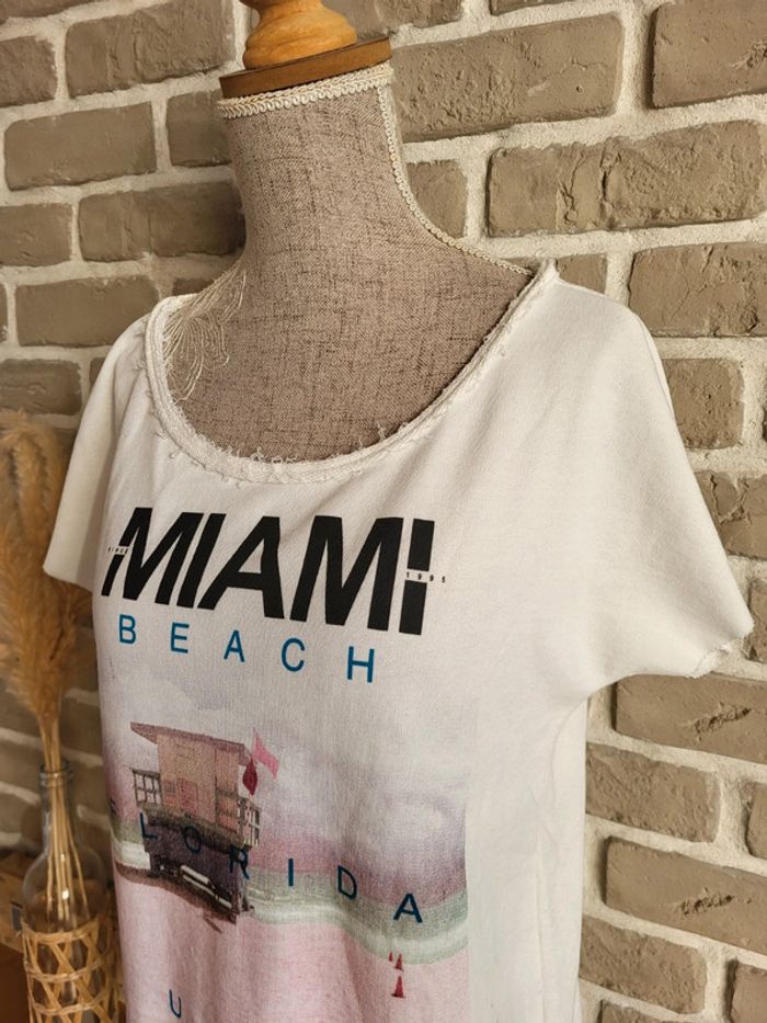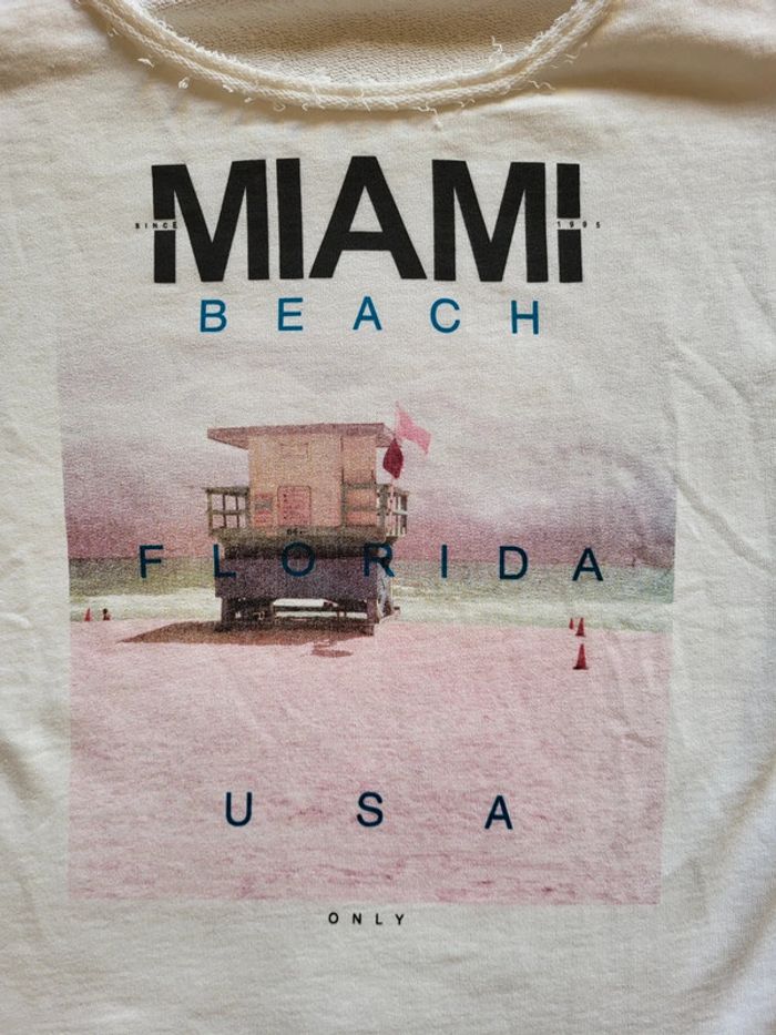 💝 Bénéficiez d'une réduction en créant lot dans mon dressing 🛍️ 🌸 T-shirt style sweat à manches courtes Only en très bon état, sans défaut 🎀 Tissu molleton blanc avec un motif imprimé sur le devant (sans usure) Miami Beach Florida USA 🪷 Col rond avec coutures effilochées . Découpage à cru aux manches 🍥 Taille XS 34, peut convenir à du S 36 🩷 Ambiance décontractée et estivale, parfaite pour un look casual et ensoleillé. Associez-le à un short en jean taille haute, des baskets blanches et des lunettes aviateur pour un style streetwear frais et facile à porter en vacances ou en ville.