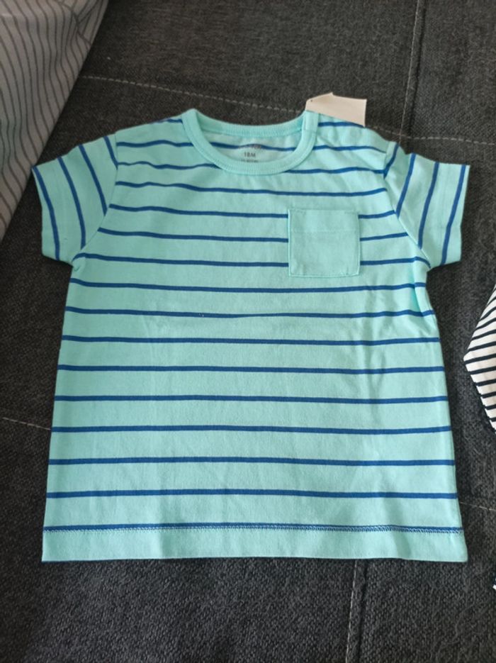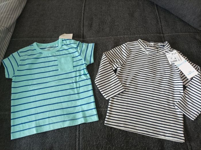 Vends un lot pour bébé garçon taille 18 mois neuf avec étiquette comprenant : 1 tee shirt manches courtes 1 pull fin manches longues a rayures