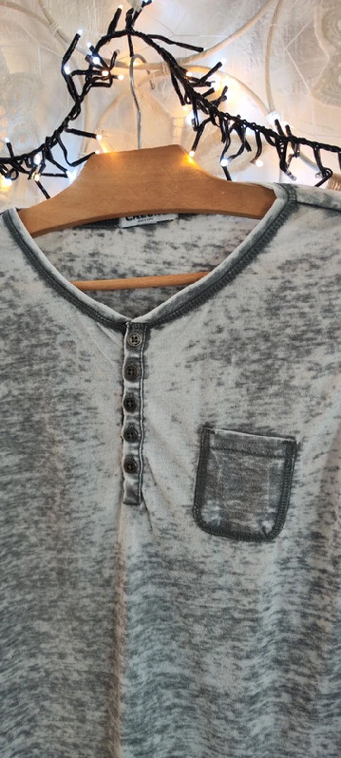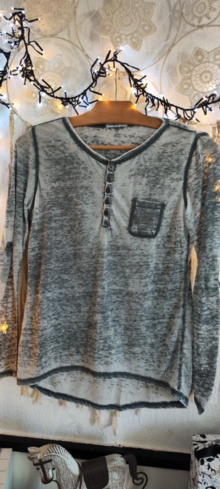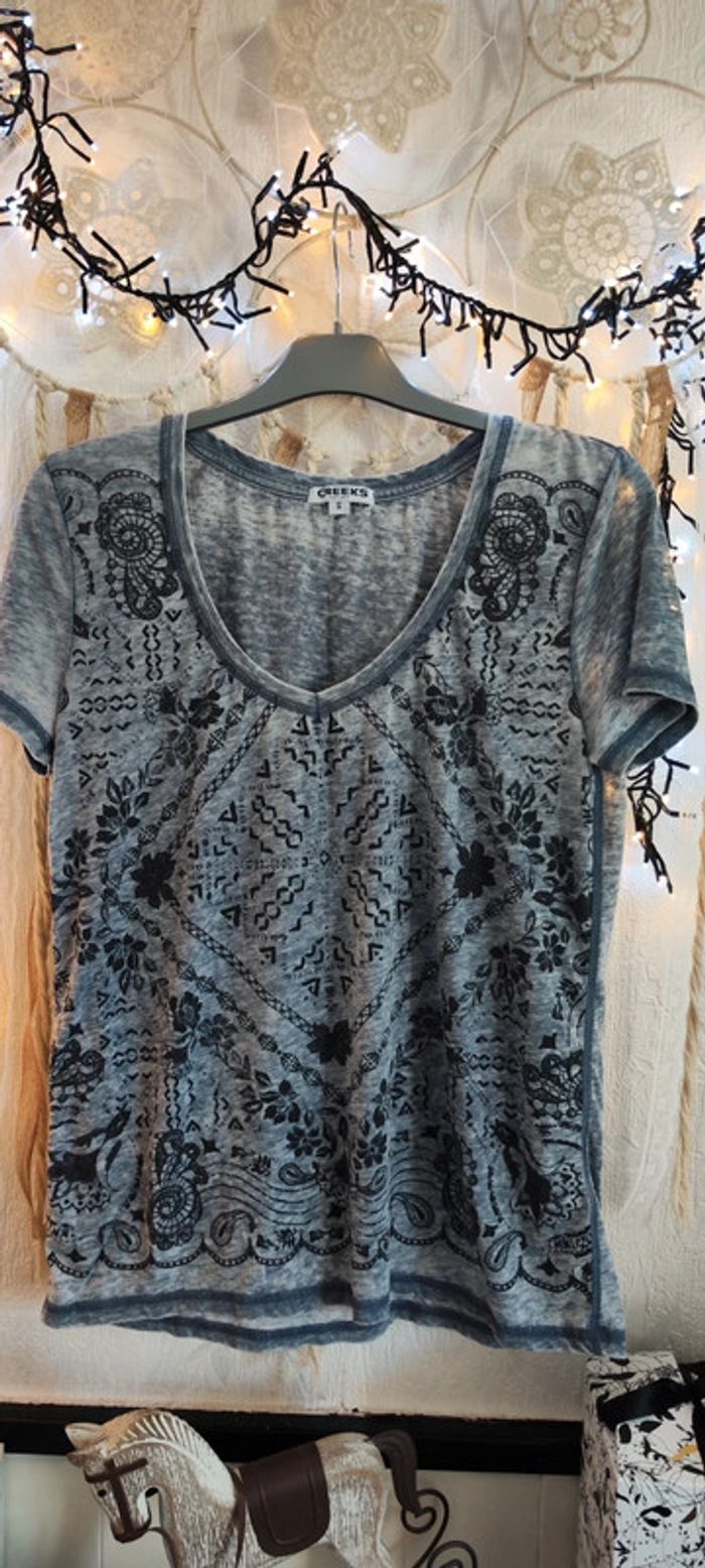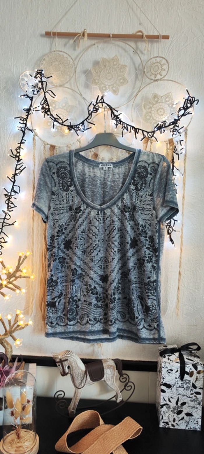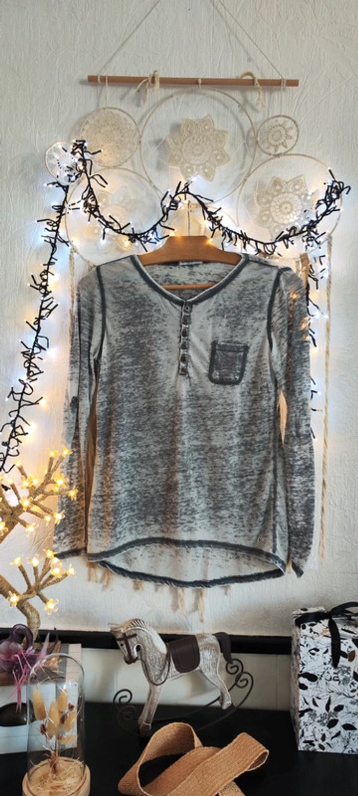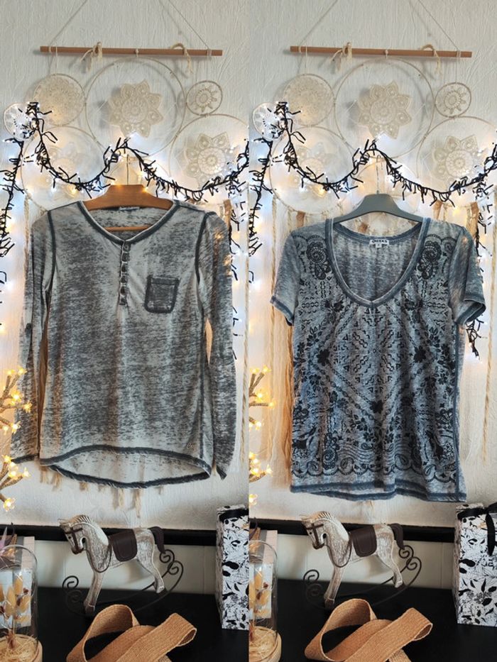 ➡️👍🏼 Bonjour ☺️ ⚠️ Merci de lire mon profil avant tout achat 🛍️ Articles neufs ou avec étiquette 🏷️ en général NON NÉGOCIABLE MÊME EN LOT 📦 Bienvenue dans mon dressing ,abonnez vous ✔️ Lot de 2 haut top tee-shirt tunique 1 manche longue à rabattre sous patte d'attache boutonné col décolleté rond fermé bouton de couleur gris chiné Bleach used poche poitrine Et 1 tee shirt manches courtes col décolleté v motif dessin imprimé mandala attrape rêve géométrique de couleur gris et noir plissé neuf À porter avec veste en jean blazer jupe chaussures à talons bottes pour un style chic ou décontracté avec sneakers basket gilet pantalon