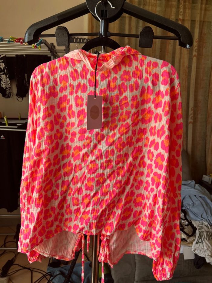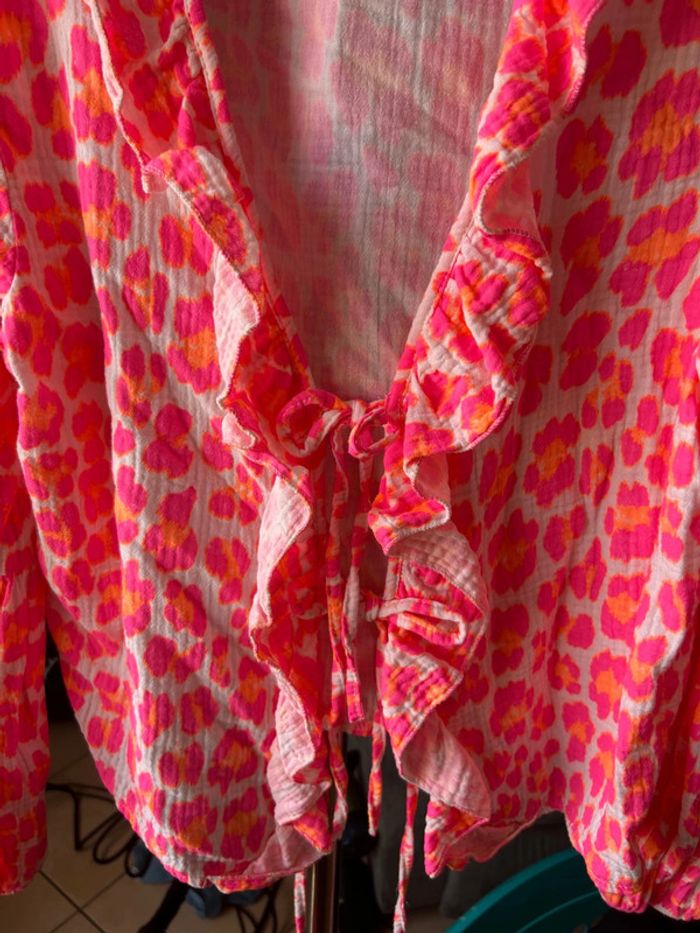 Blouse ML Élastique aux poignets Rose et orange fluo Fermeture par noeuds Taille unique Gaze de coton