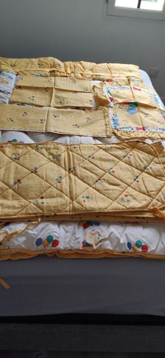 Parure de lit complet bébé mixte neuf. Jamais servi. Comprenant une couverture 140x96 qui peut être déhoussable à l'arrière (voir dernière photo). Un drap plat 90x170. Et 2 housse pour petit oreiller. Ainsi qu'un tour de lit 40x200.